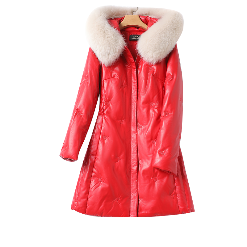 Down jacket women's medium long version fox fur collar plus size sheep leather clothing anti-season sheep leather female coat white duck suede