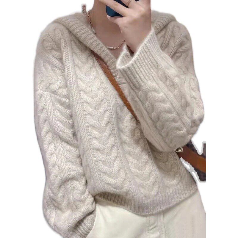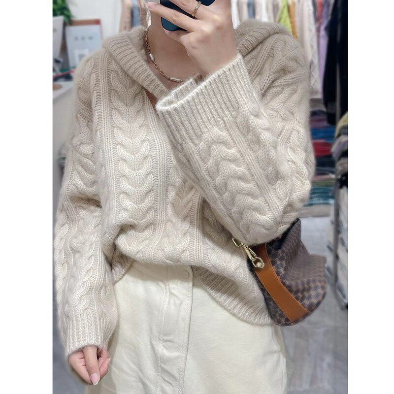 22 Autumn and Winter Hooded 100% Wool Sweater Thickened Loose Lazy Cashmere Knitted Sweater Twist Pullover Sweater
