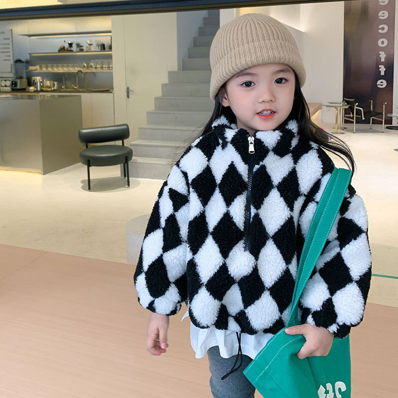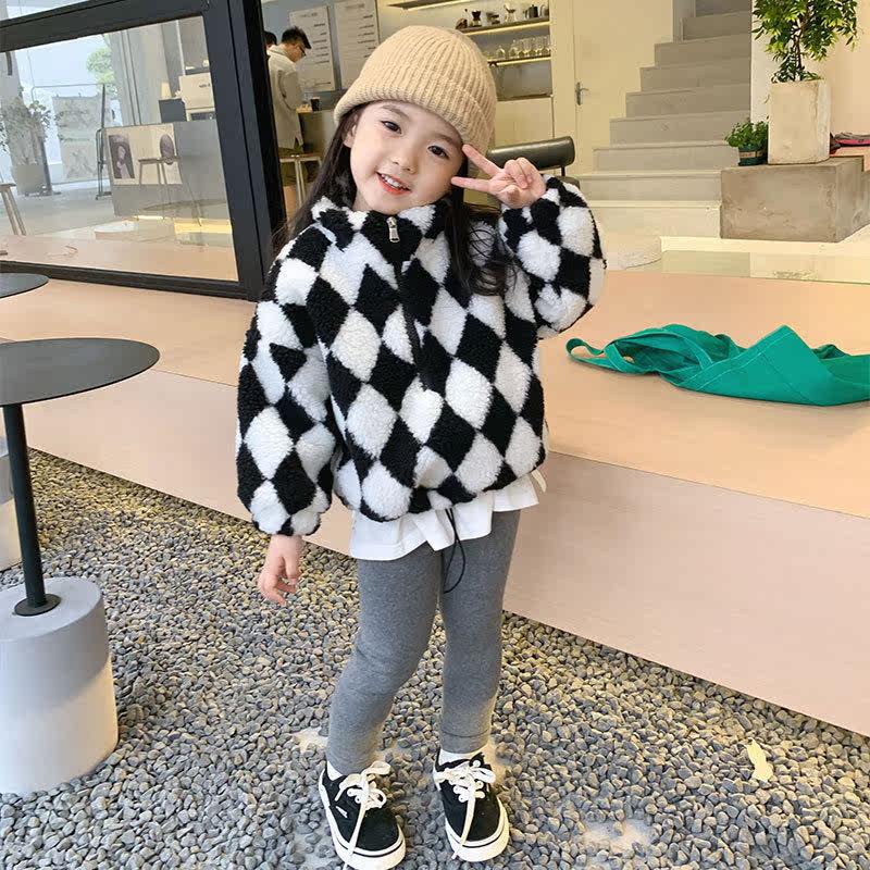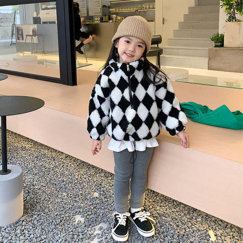 Girls sweater 2021 autumn and winter new simple trend black and white checkered fake two-piece children's baby all-match warm top