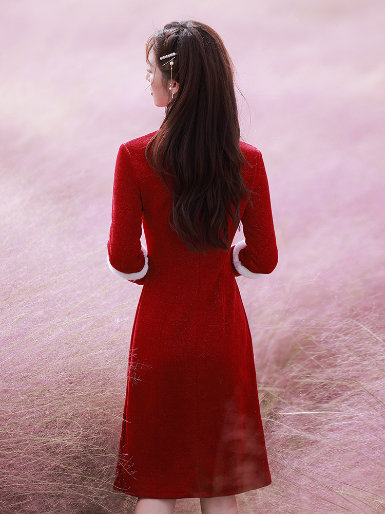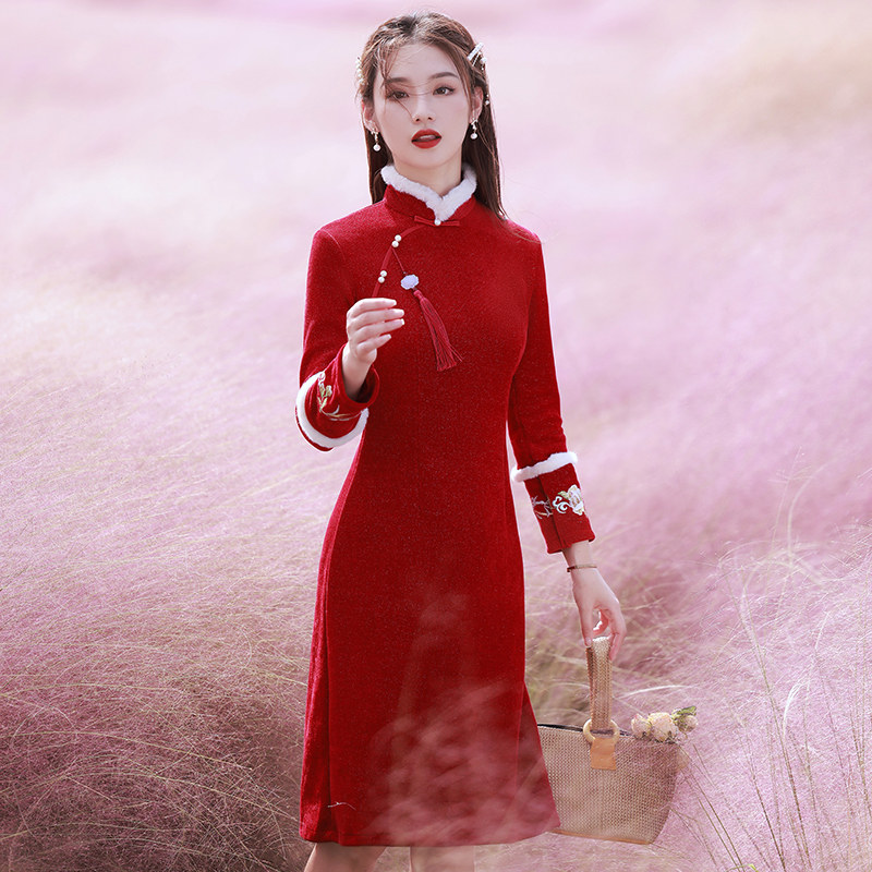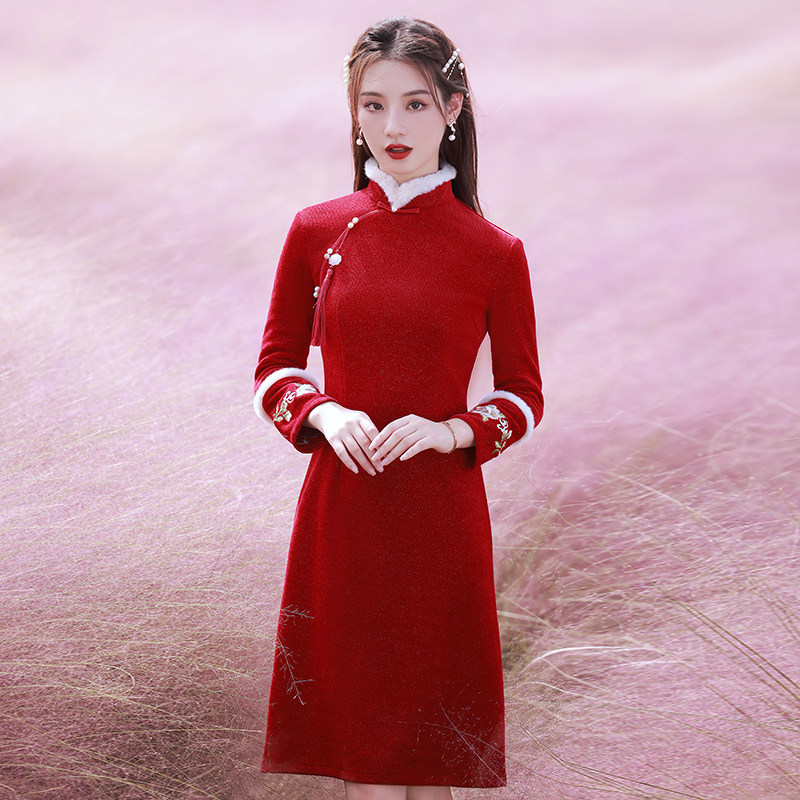 Qipao 2022 New Red Advanced Sensation Winter Style Thickening Improved Version Young HIGH-END TEMPERAMENT LONG SLEEVE AUTUMN WINTER