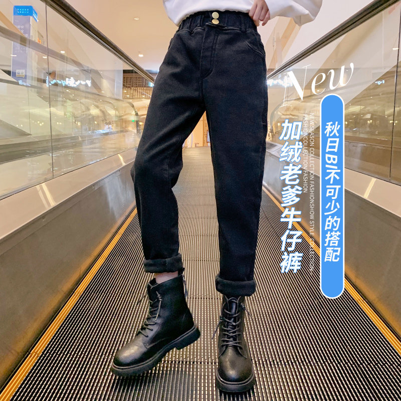 Girls plus jeans wear 2023 new autumn and winter big children thicken warm and one - fled casual trousers