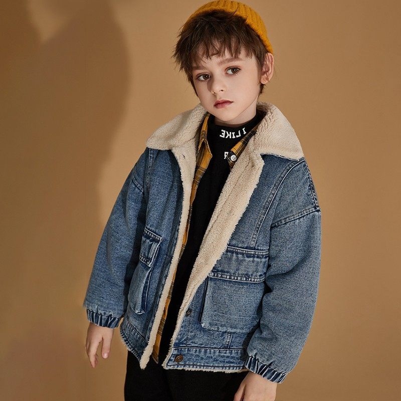 Boys' denim plus velvet jacket 2022 autumn new autumn and winter style trendy Korean version of the children's lamb velvet thick fried street