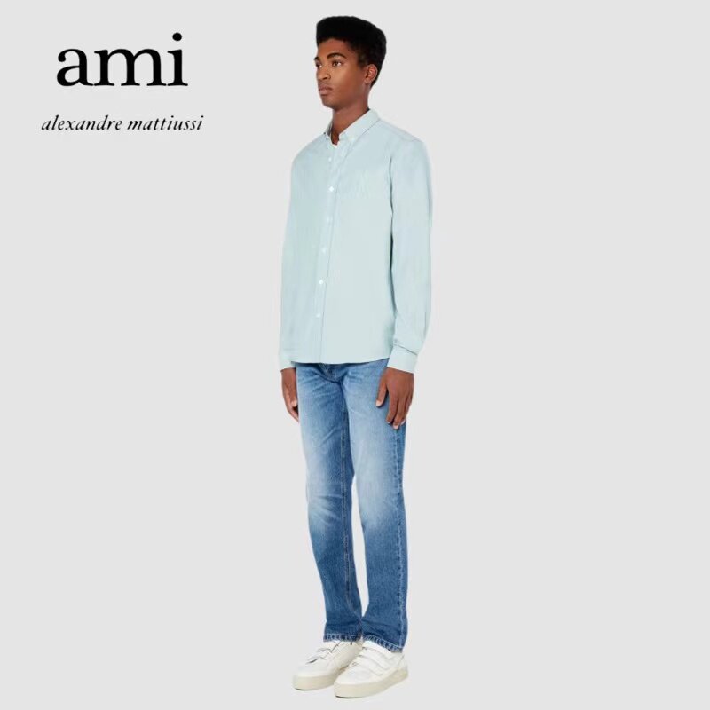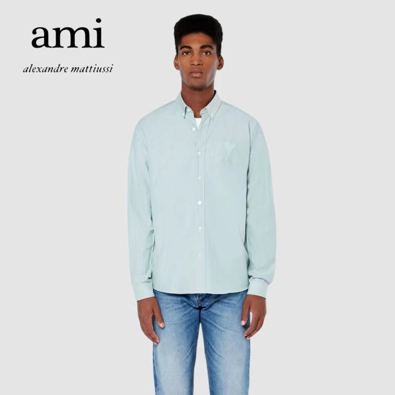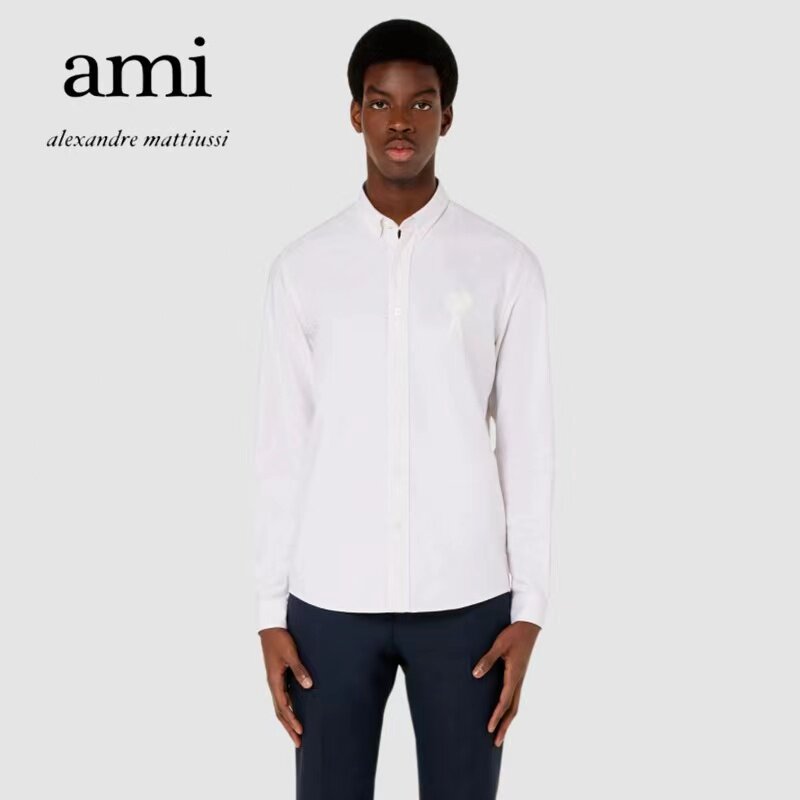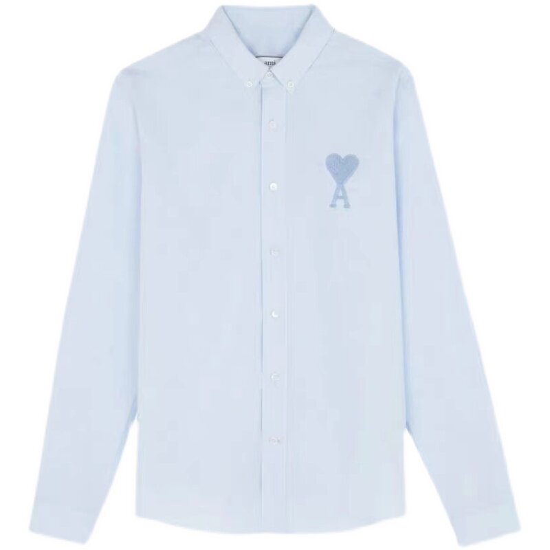 Ami Paris 21 Spring and Autumn New Ironing-Free Sharp Neck Long Sleeve Shirt Men's and Women's Same Color Love Embroidered Shirt Tide