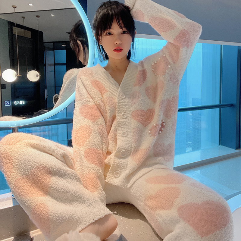 Pearl love soft long-sleeved trousers Korean version casual sweet pajamas women's winter thickening suit home service