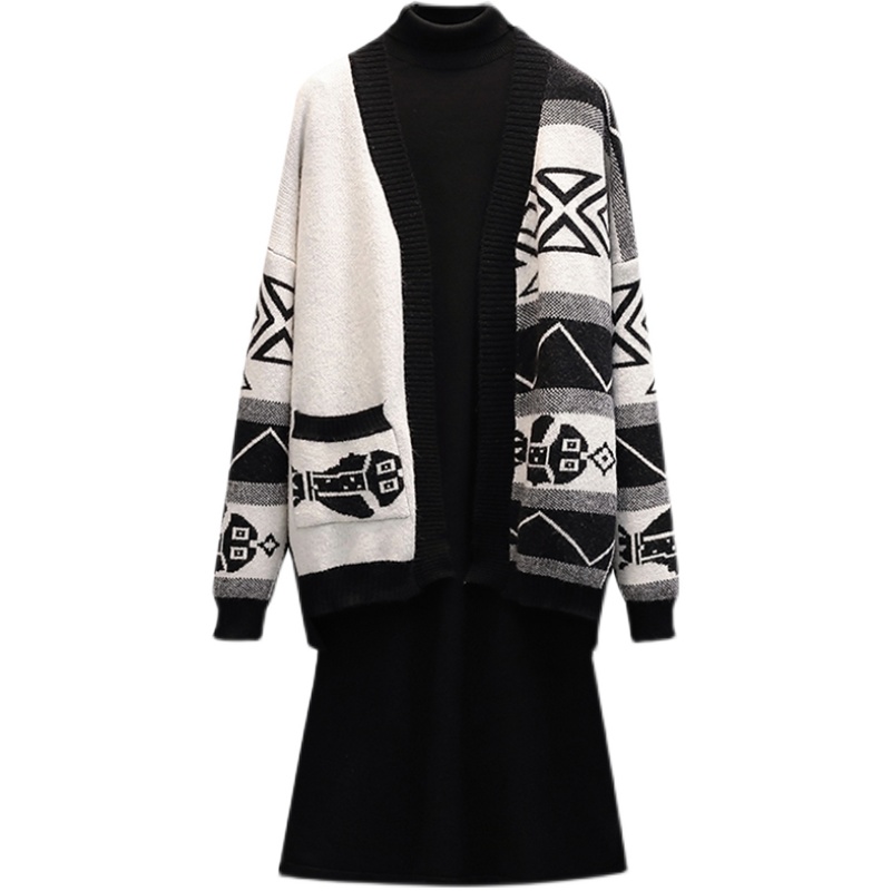 Middle-aged large size women's autumn and winter new slim sweater cardigan coat knitted dress fat mother two-piece suit