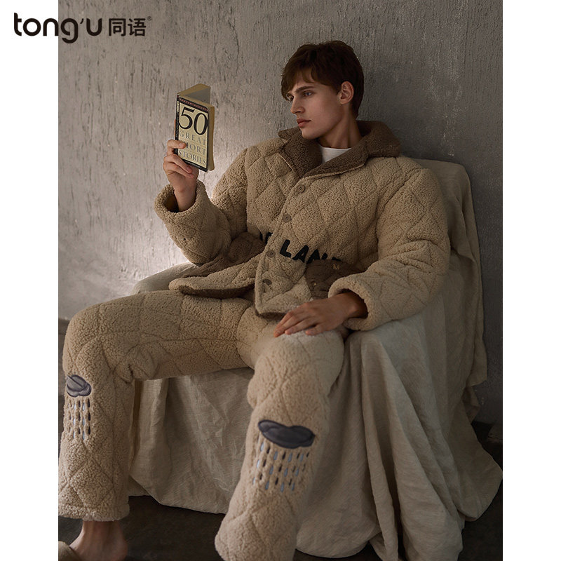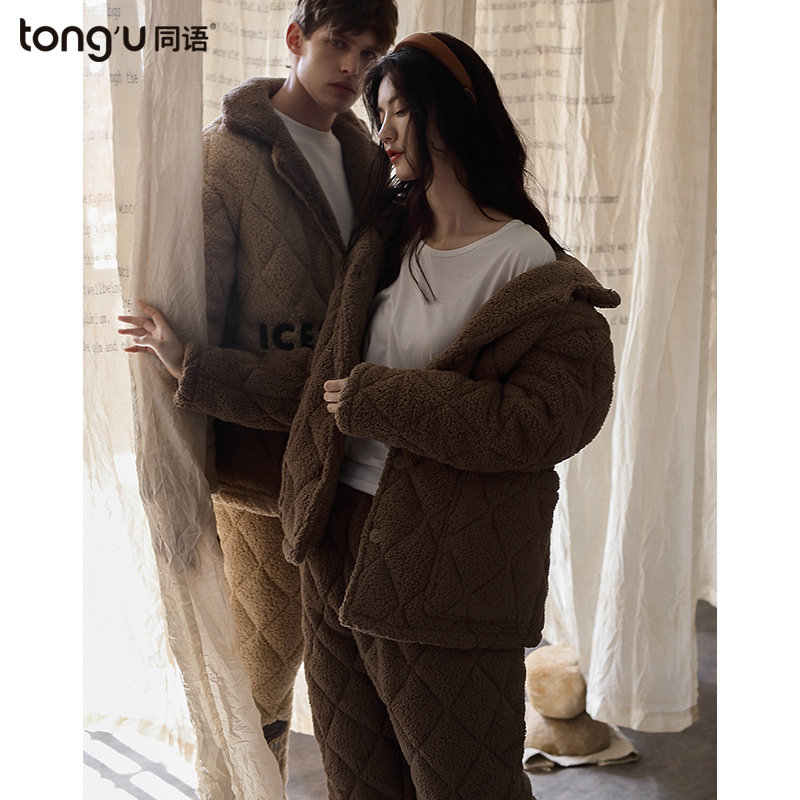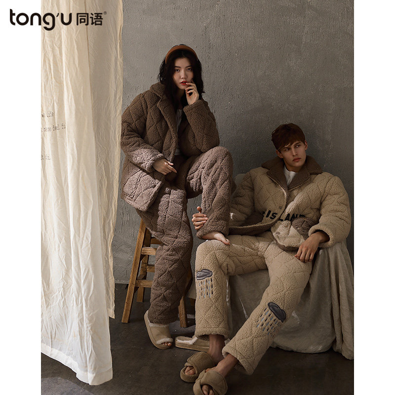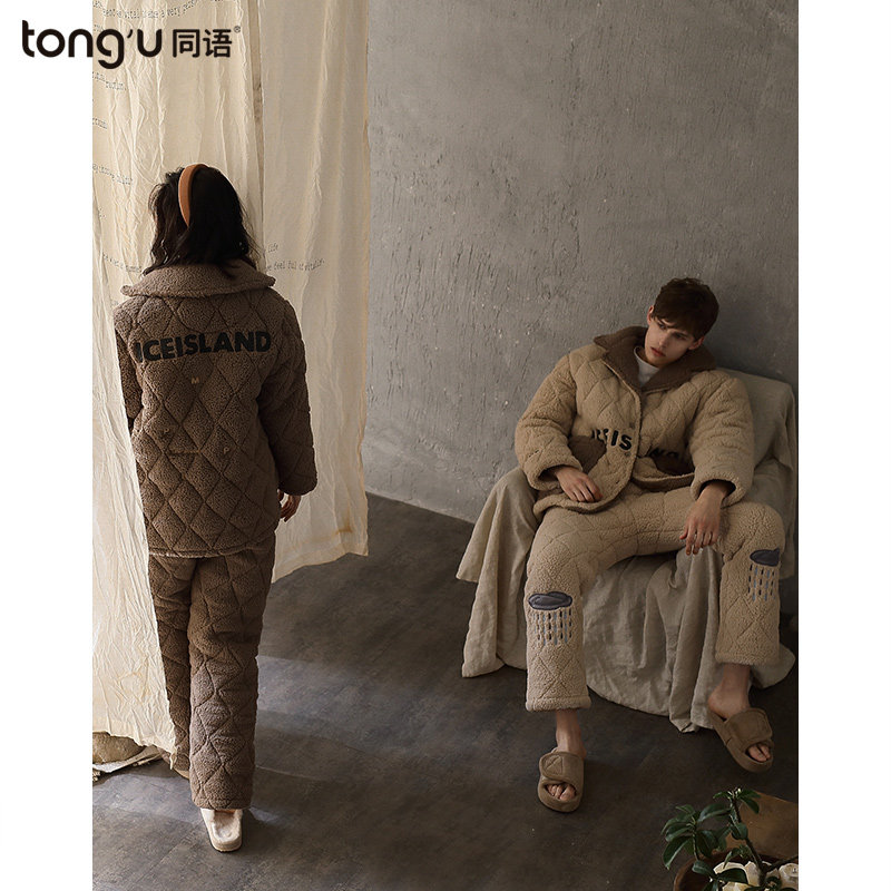 Same language couple winter three-layer cotton thickened coral velvet home clothing female flannel plus velvet padded suit