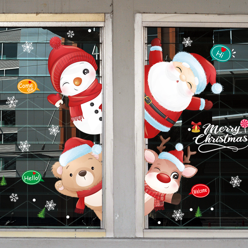 Cartoon cute santa claus storefront window glass door new year's day new year welcome to snowman shopping mall decoration