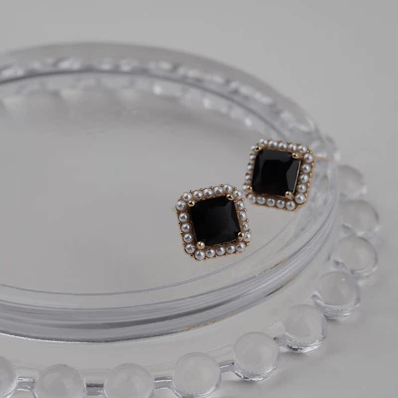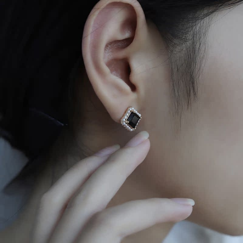 Geometric mini pearl black manauear needle little fragrance wind elegant retro temperament ear decoration pure silver
