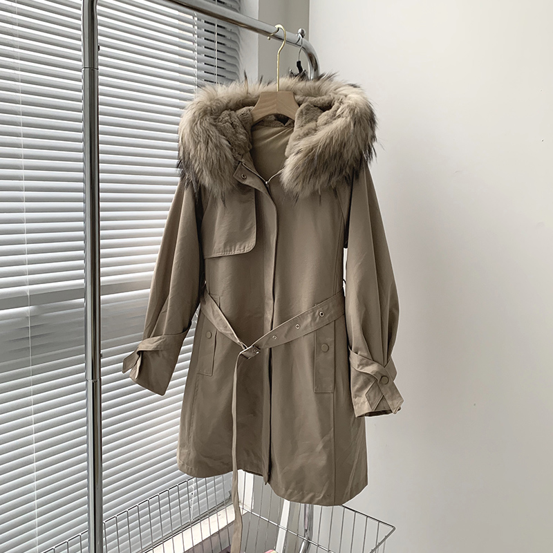 Raccoon fur collar Rex rabbit fur liner pie to overcome women's mid-length hooded 2022 winter new small fur coat