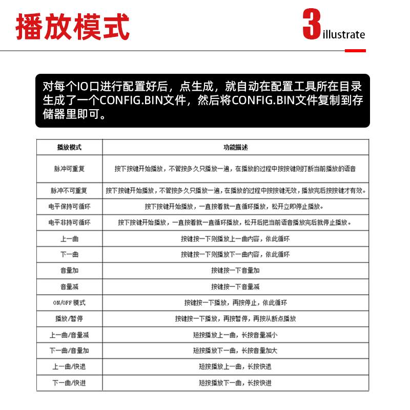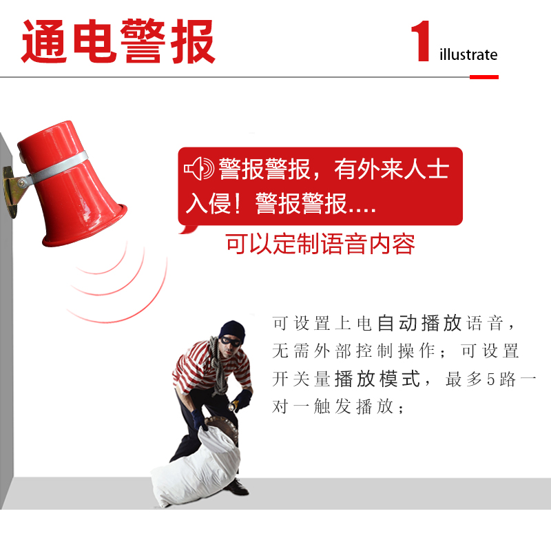 Power-on loop playback 7-way switch control (low level trigger) 7-way switch control (high level trigger) Wireless remote control playback 220V to 12V power adapter