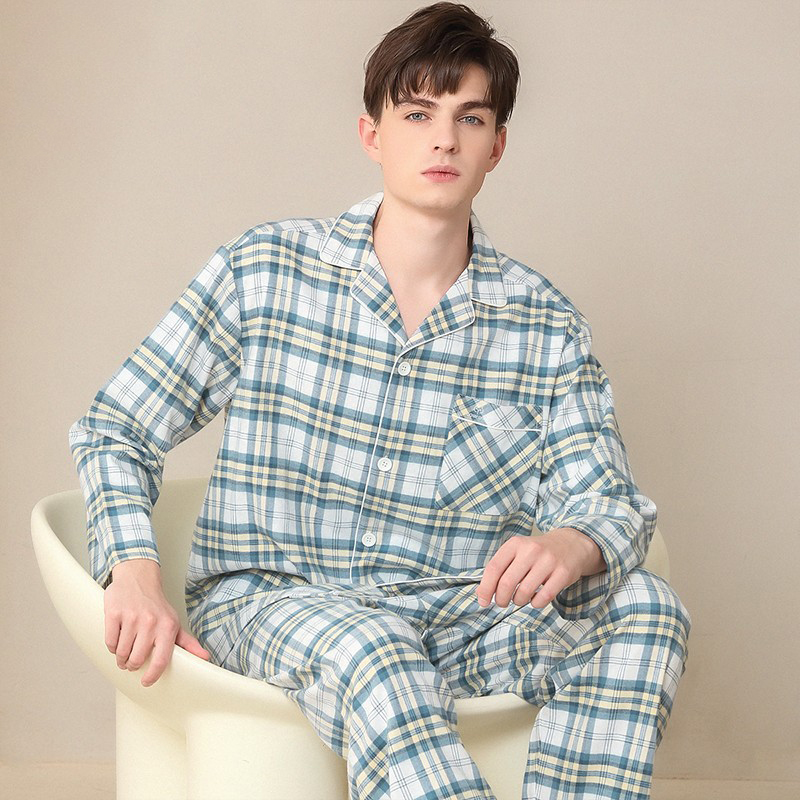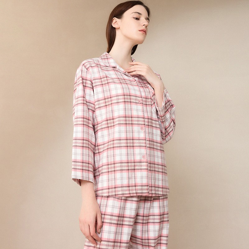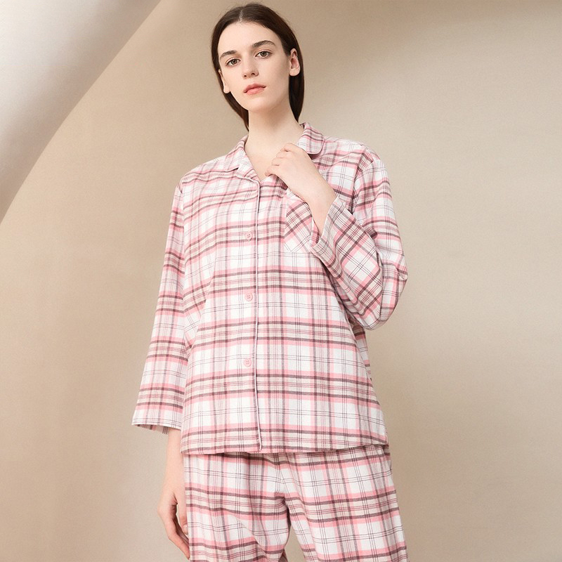 Red bean spring and autumn long sleeves cotton brushed couple pattern home clothes set women's woven simple loose plaid pajamas