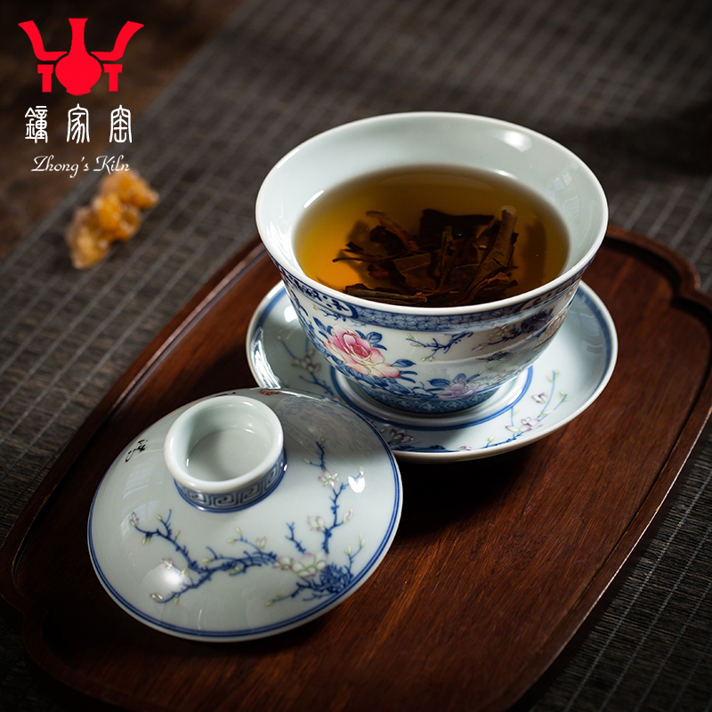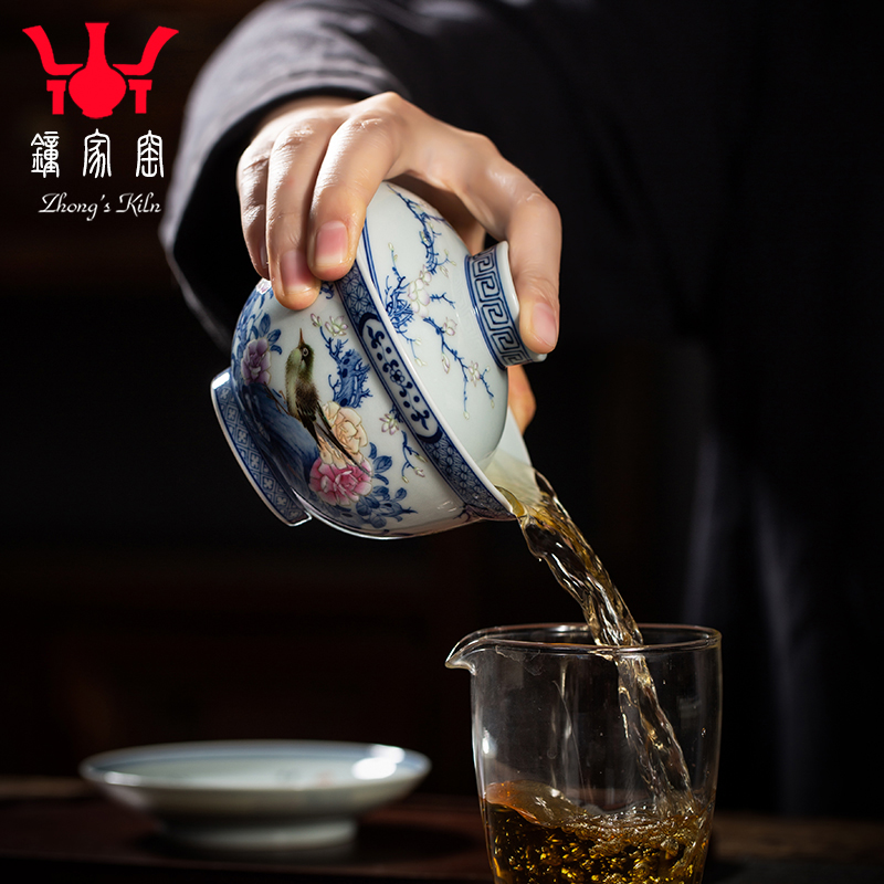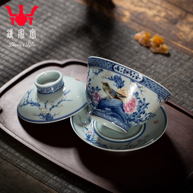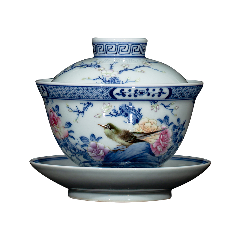 Bell Family Kiln Ceramic Lid Bowl Jingdezhen Fame ten thousand Haihua Teacher Pure Handmade Blue Flower Colorful Flowers Birds Triple Bowl-Taobao