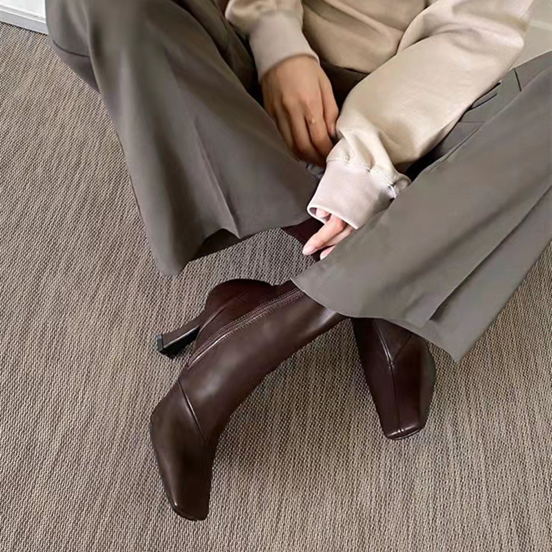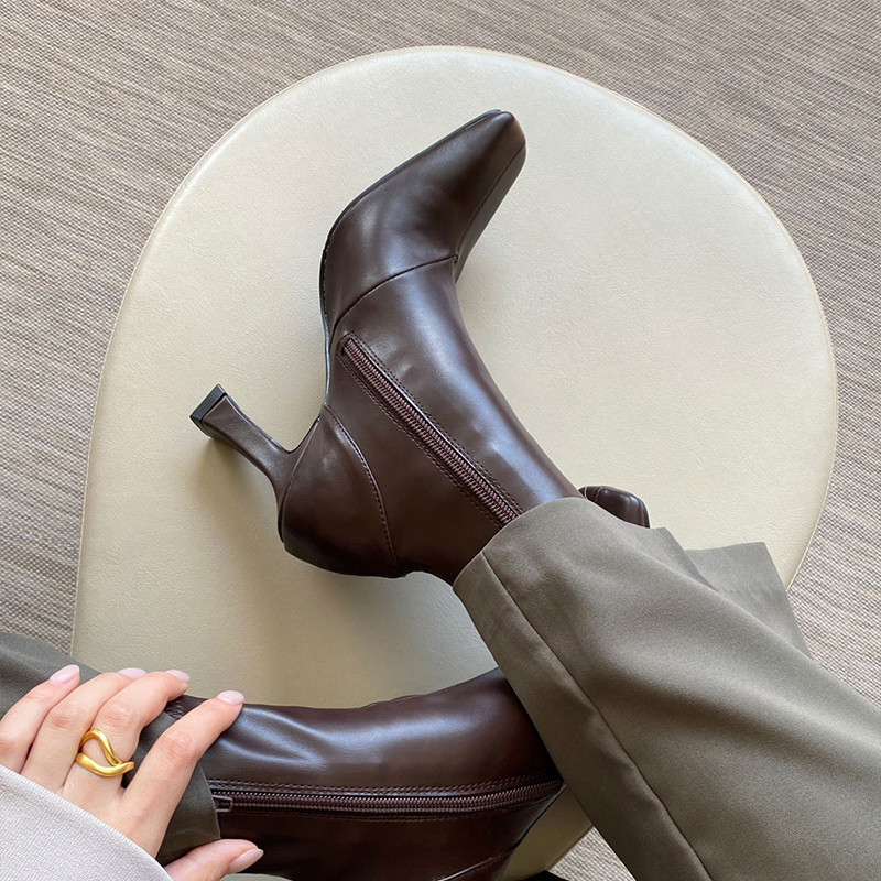 "Handmade" High-end Retro Square Toe Elastic Boots Cat Heel Thin Sexy Short Boots Female Nude Boots