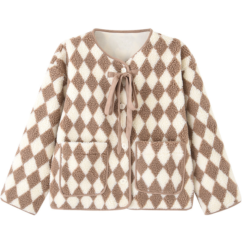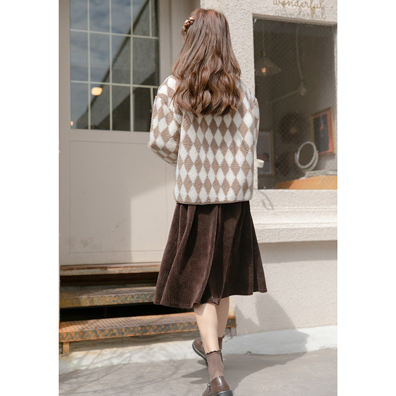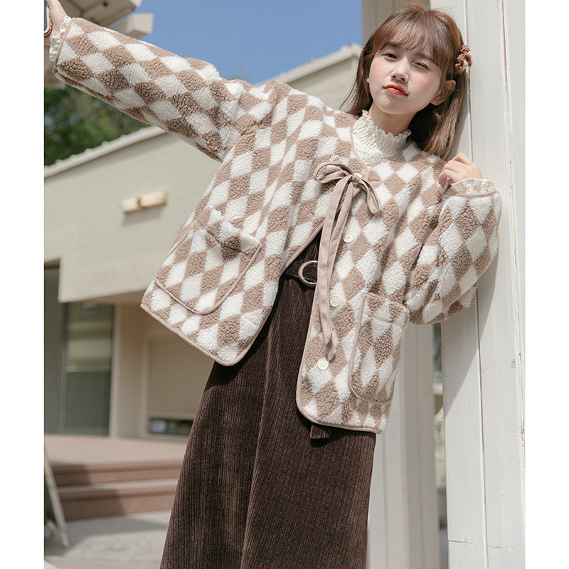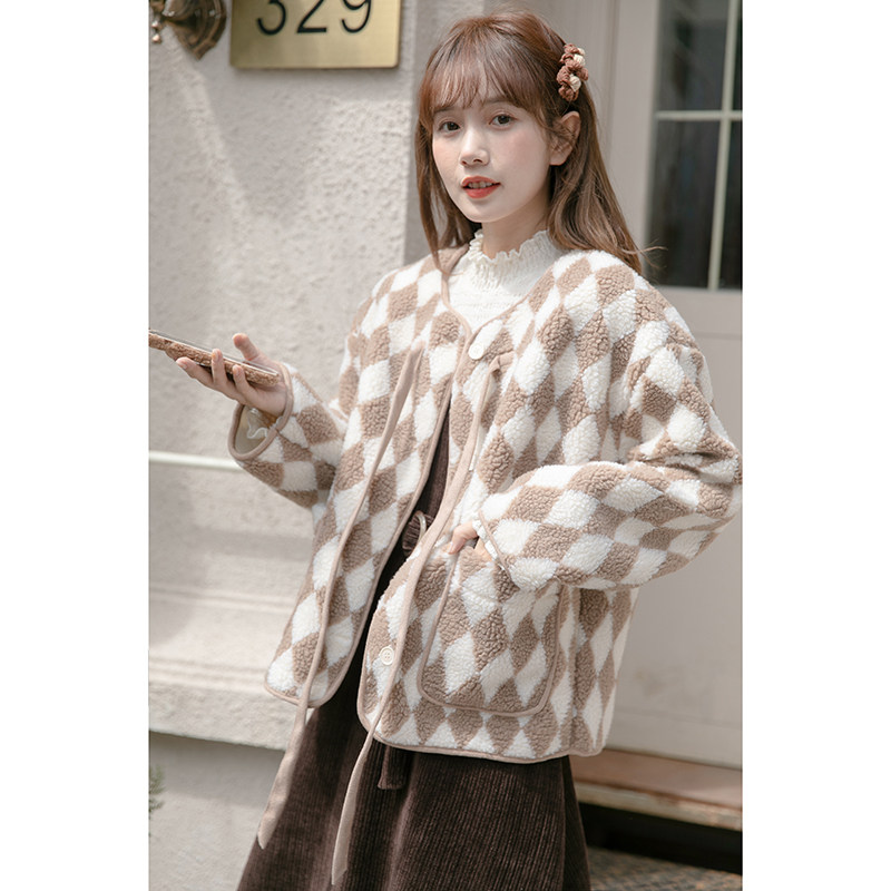 Lamb suede rhombus Thickened Jacket Woman 2021 Winter New Korean version Leisure Fashion relaxed Short Warm Jacket