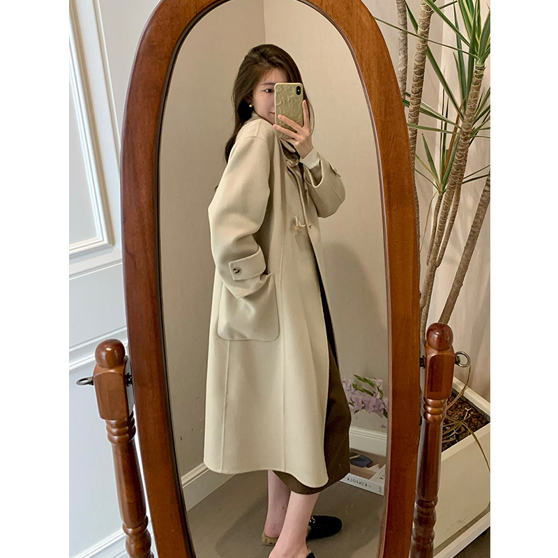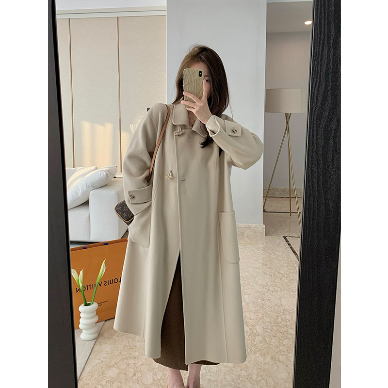 MUKOK white bifacial cashmere big coat woman 2023 autumn winter new high-end horn button pure colour medium long jacket-Taobao