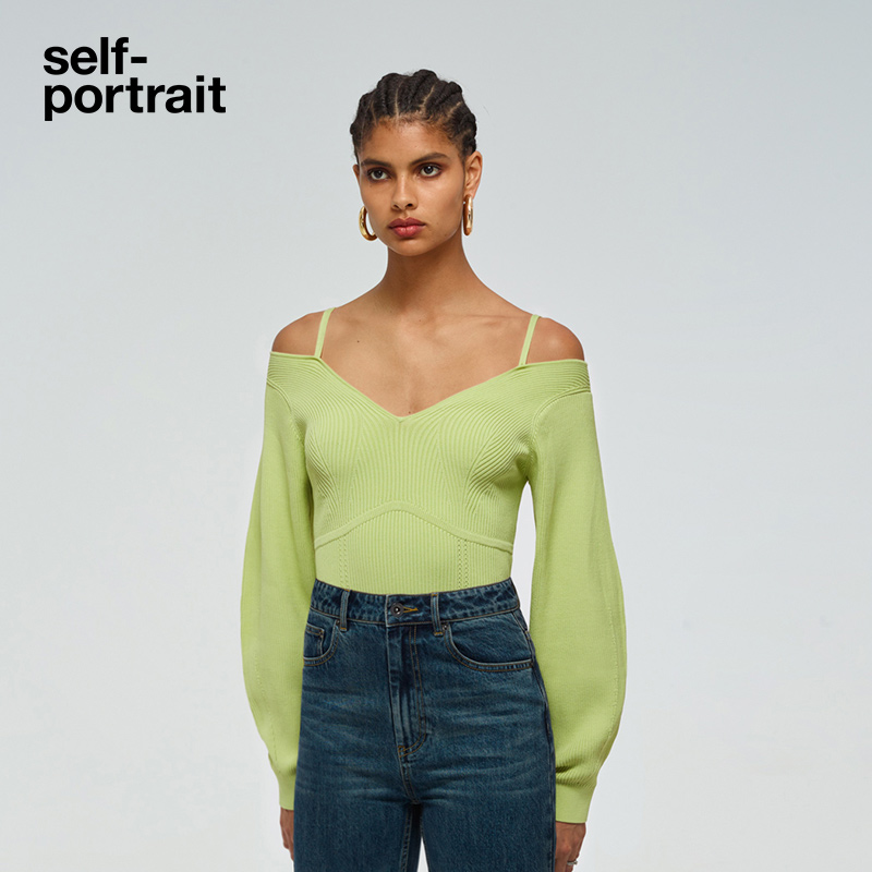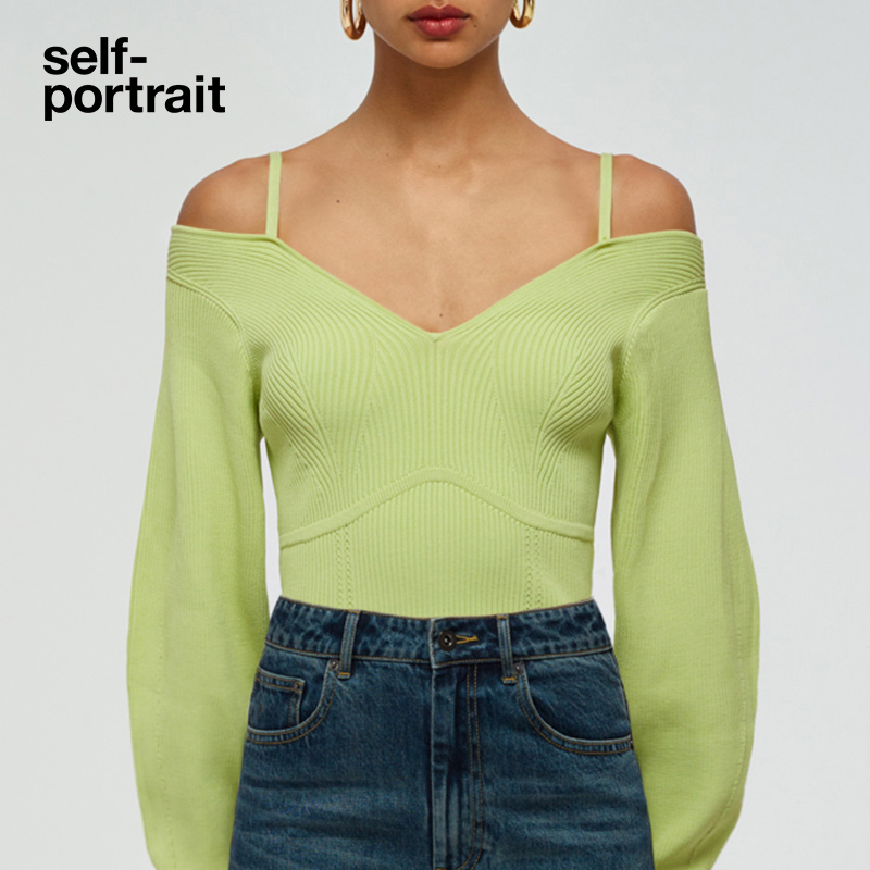 self-portrait fruit green knitted off-the-shoulder suspender long-sleeve top