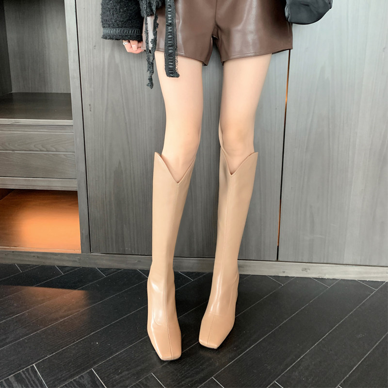 Square head Lean Long Barrel Boots Woman High Heel V Mouth Riding Boots Elastic Slim Slim High Cylinder Boots Milk Tea Color Long Boots Autumn Winter