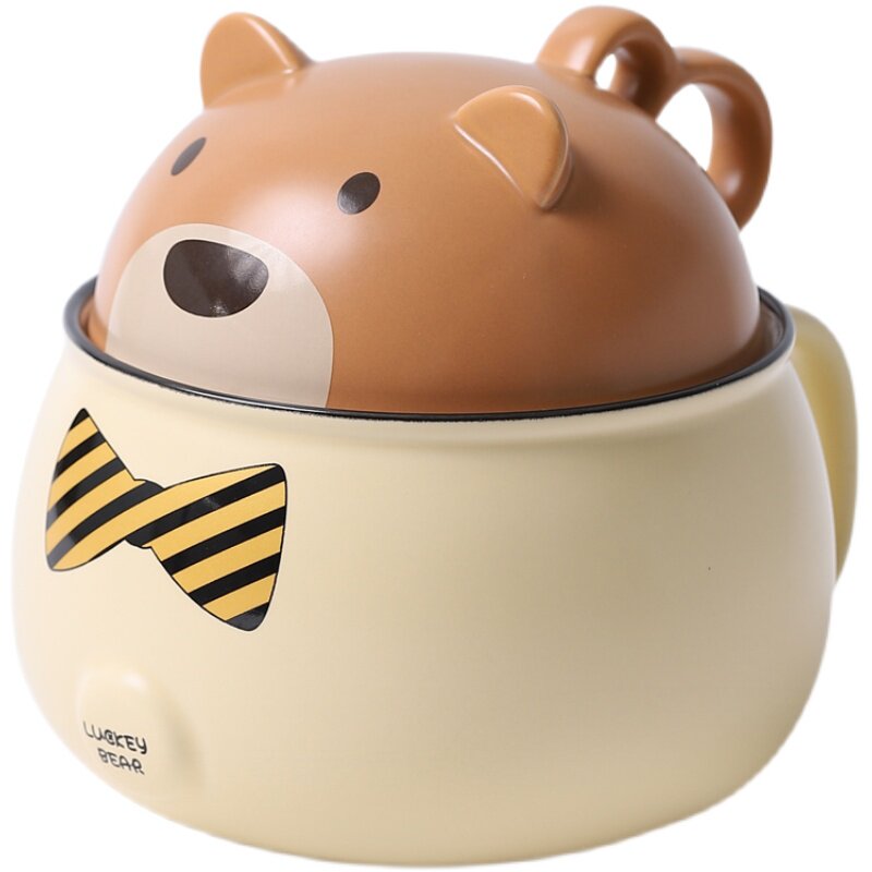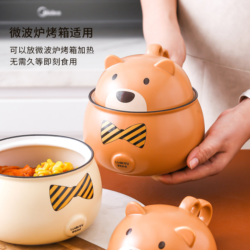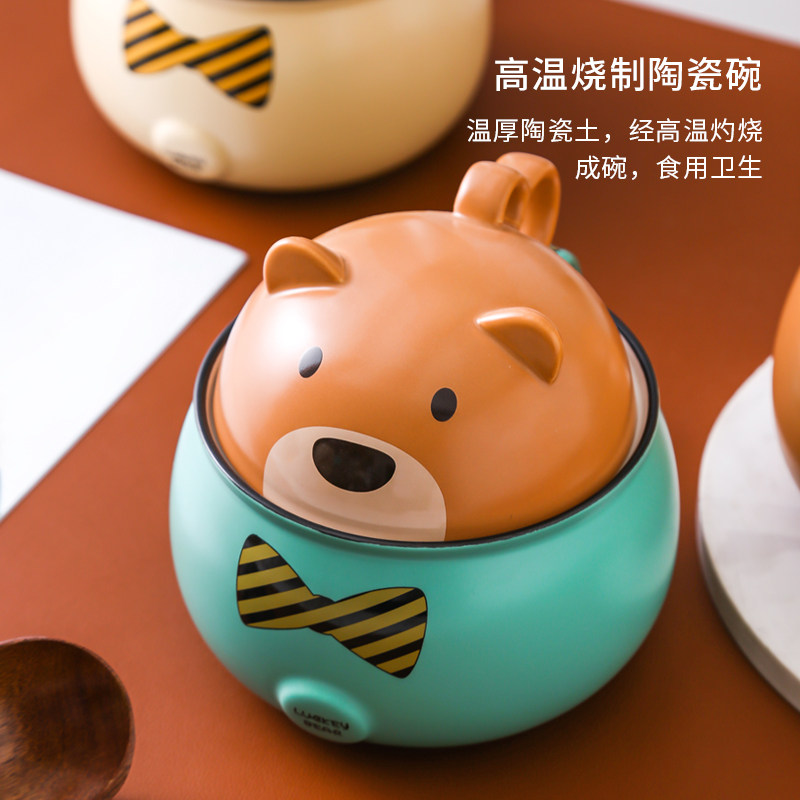 Cartoon cute ceramic bowl student dormitory eating bowl instant noodle bowl creative rice handle anti-scalding with lid bowl home