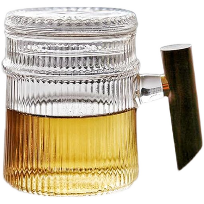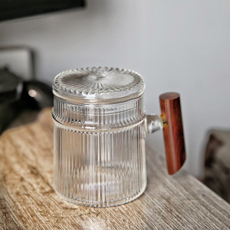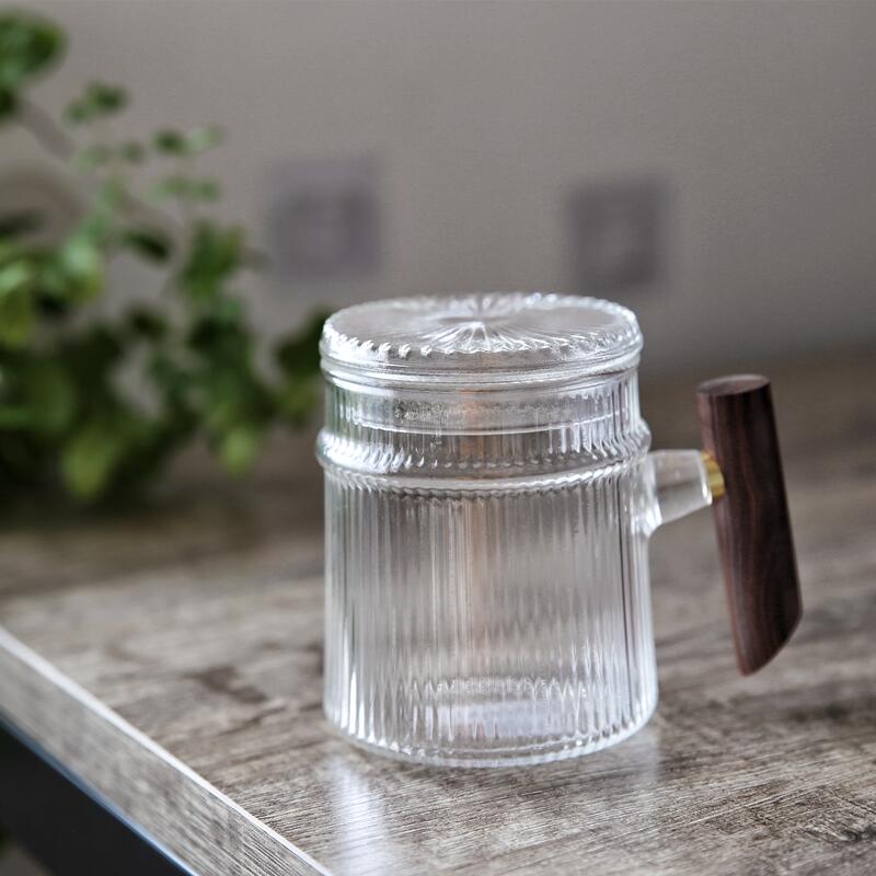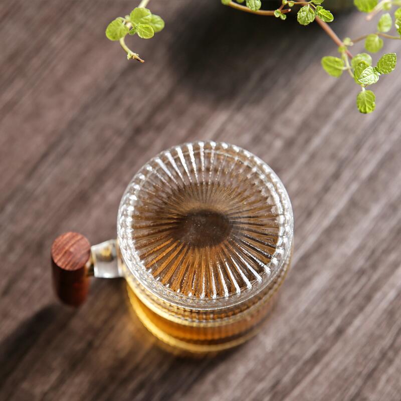 Fashion day-style striped transparent and transparent with lid glass-cup handmade round wood handle tea heat-resistant water glass