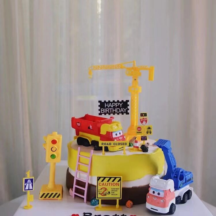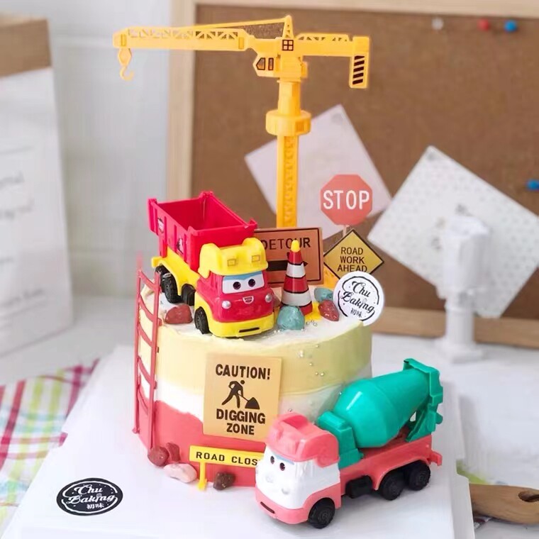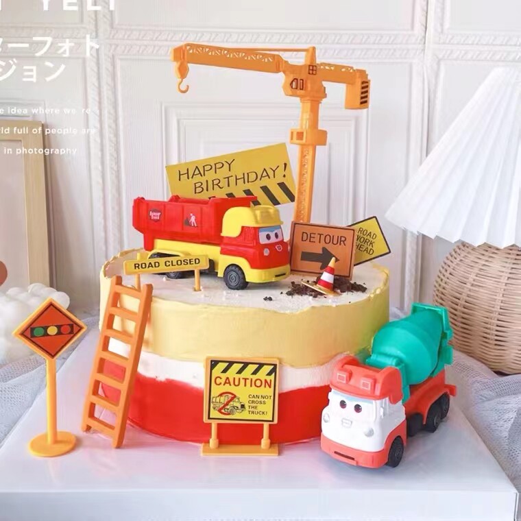 Creative little boy birthday cake decoration engineering vehicle excavator mixer truck theme decoration road sign baking plug-in