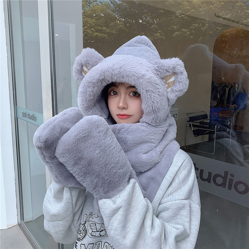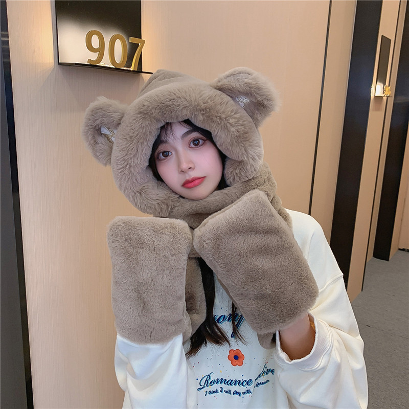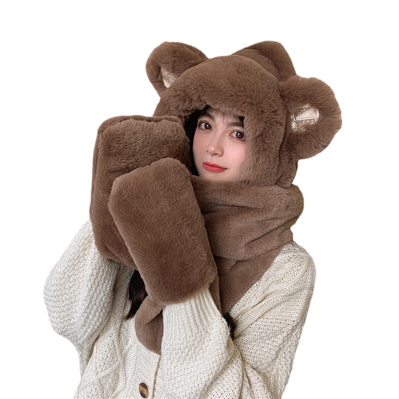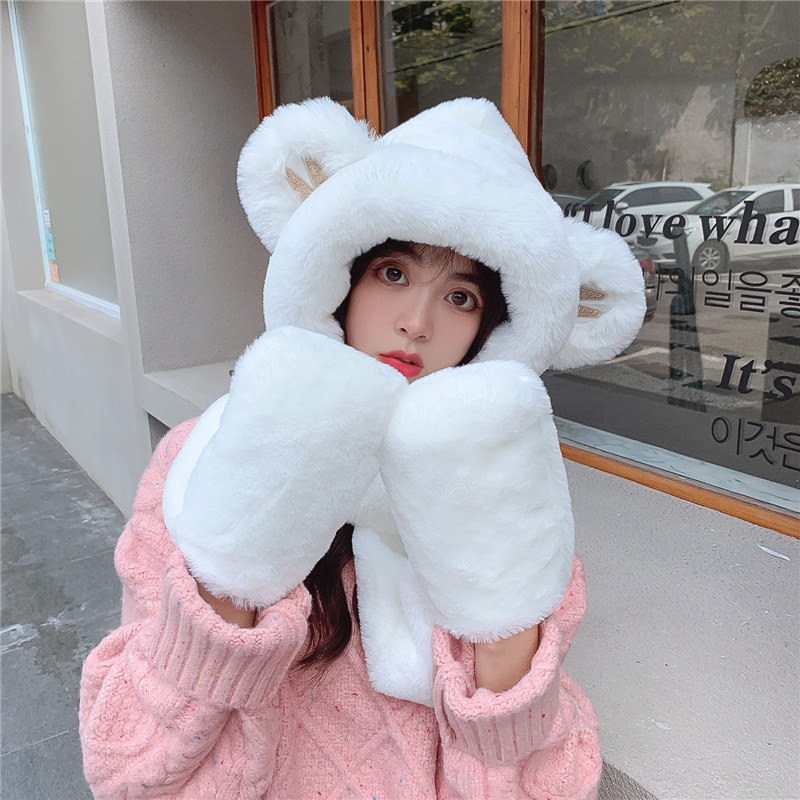 Northeast minus 40 degrees cold wind and snow hat, scarf, gloves, three-piece set of women's Baotou ear protection bear plush to keep warm