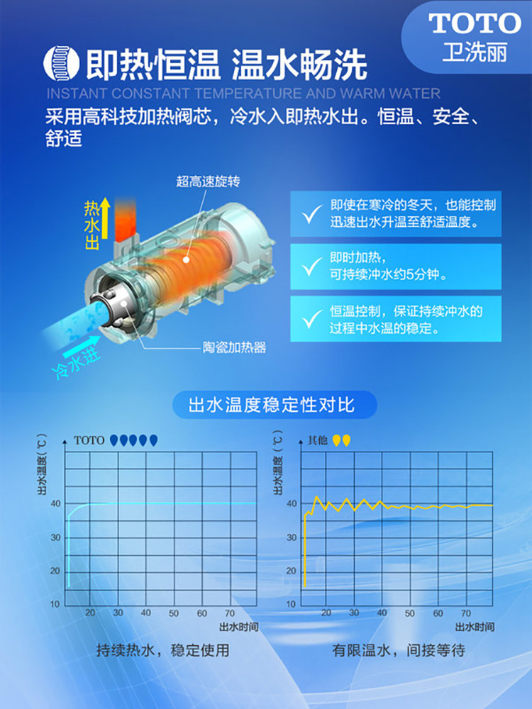 Hip wash Ladies wash Seat heating Water temperature adjustment Rinse water pressure adjustment Drying Nozzle self-cleaning Automatic deodorization Remote control Nozzle moving cleaning Instant heat type
