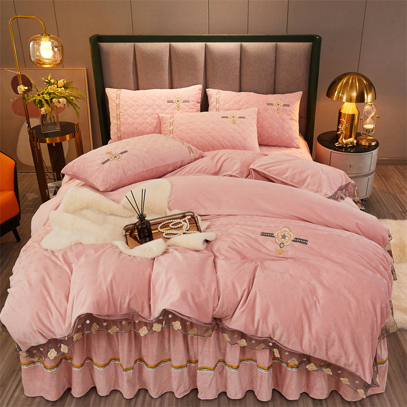 Quilted thick bed skirt four-piece baby fleece milk fleece crystal gold velvet coral flannel bed single bed cover