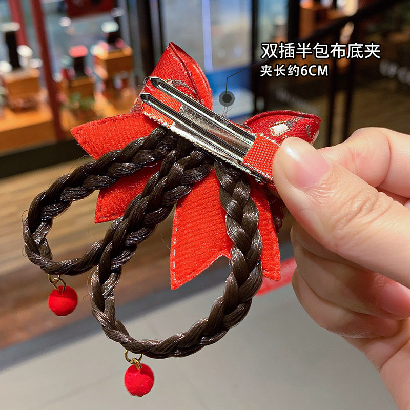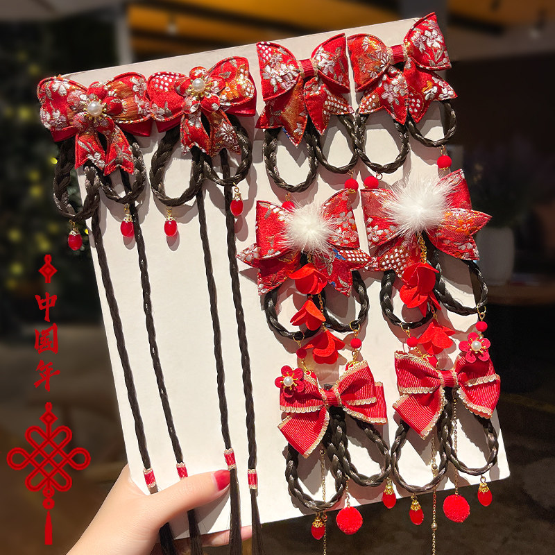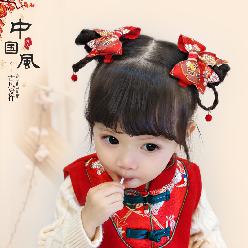 Red New Year Children's Hairpin Chinese Style New Year Headdress Wig Hanfu Hairpin Heaveflower Baby Girl's New Year Hair Accessories