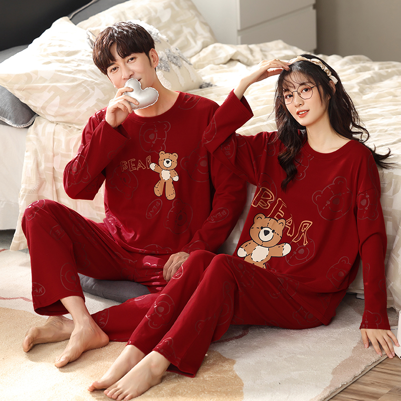 Lovers Pure Cotton Pyjamas 2021 Spring Autumn New Cute Cartoon Big Red Wedding Thin ROUND COLLAR LOOSE SUIT WOMAN