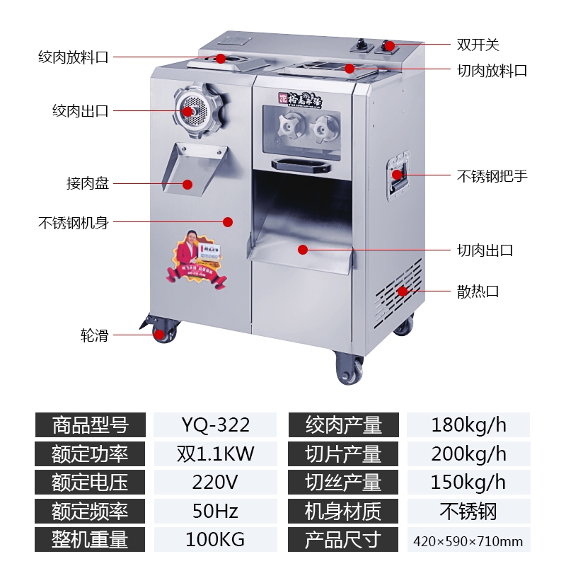 Yongqiang Meat Grinder Commercial Meat Cutter YQ-322 Grinding Dual Purpose Slicer Shredding Pulverization Large Electric Minced Meat