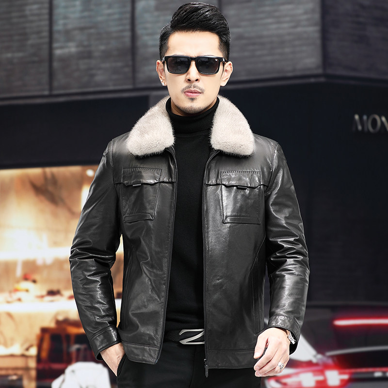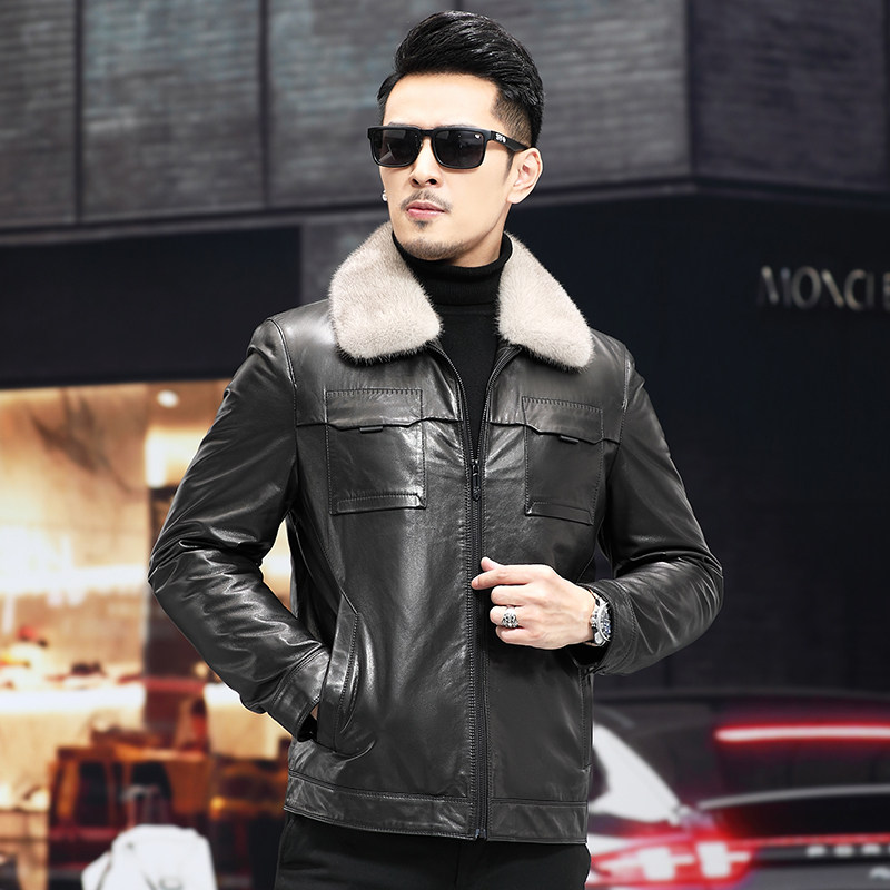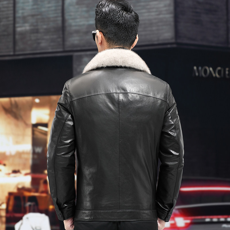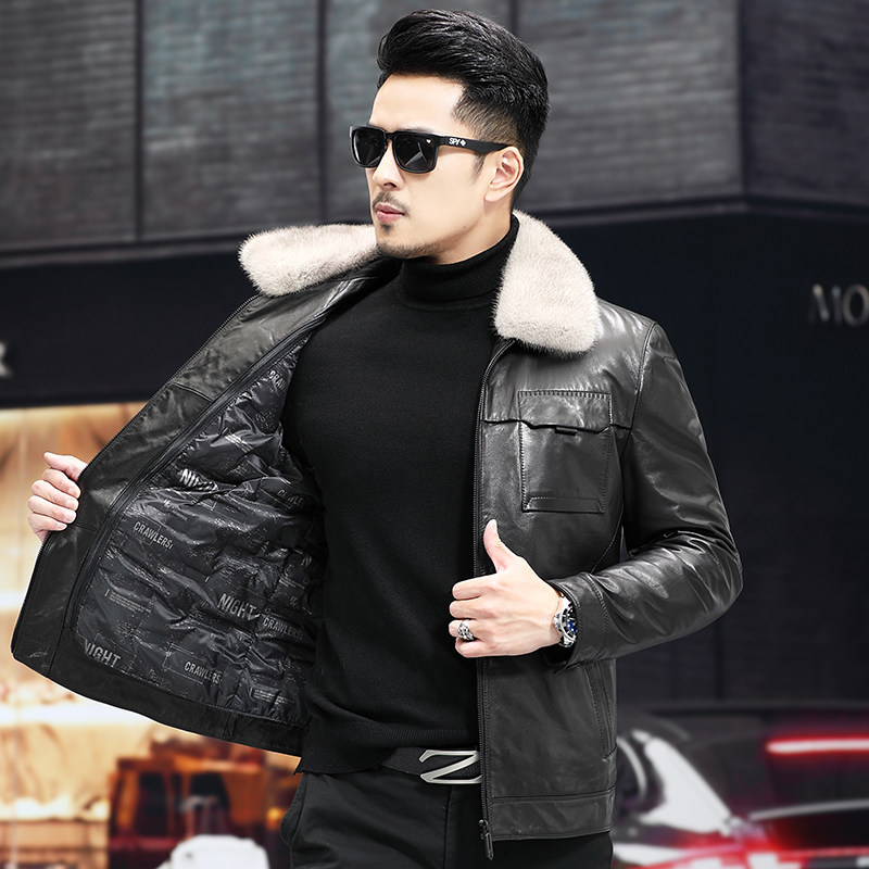 New Haining Fur Dress Men's Goat Leather Jacket Short Mink Tip Remove Down Coat