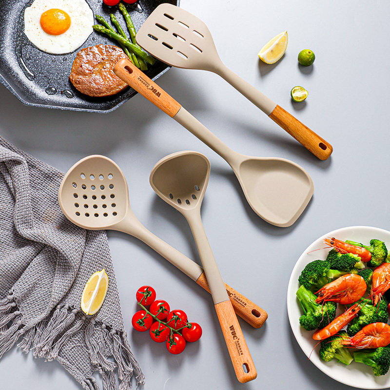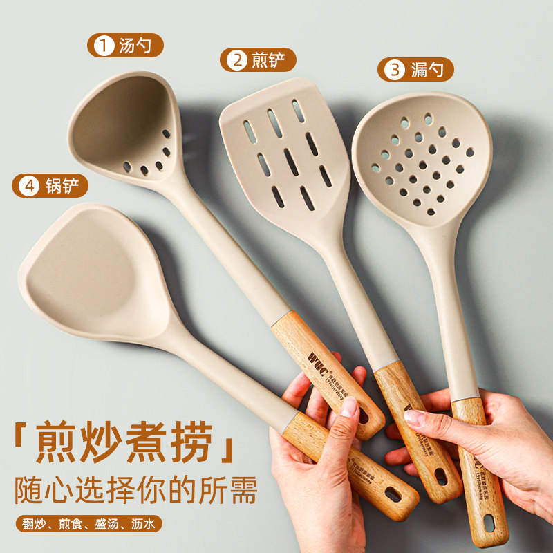 Wooden handle silicone vegetable spatula Wooden handle silicone soup spoon Wooden handle silicone colander Wooden handle silicone frying spatula 2 pieces set (vegetable spatula + frying spatula) 2 pieces set (vegetable spatula + soup spoon) 2 pieces set (vegetable spatula + colander) 2 pieces set (frying spatula + soup spoon) 3 pieces set ( vegetable spatula + soup spoon + colander) 3 pieces set ( spatula + decoction spoon + colander ) 3 pieces set ( decoction spatula + soup spoon + colander ) 4 pieces combination (spatula + soup spoon + colander + frying spatula) 7 pieces combination (vegetable spatula + soup spoon + colander + colander + frying spatula + frying spatula + rice spoon + bracket)