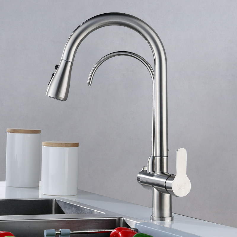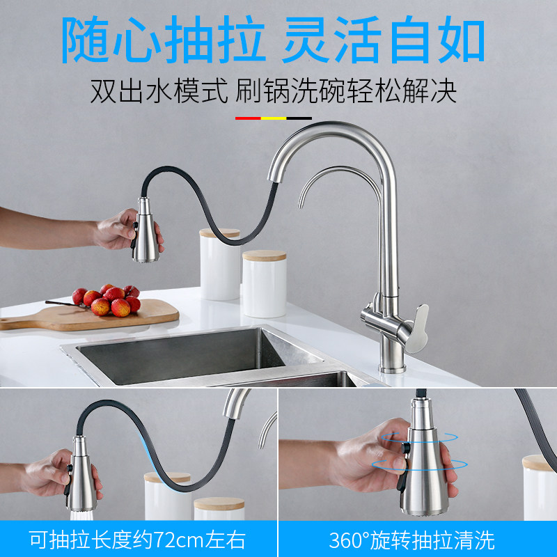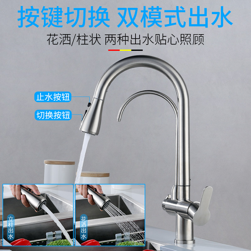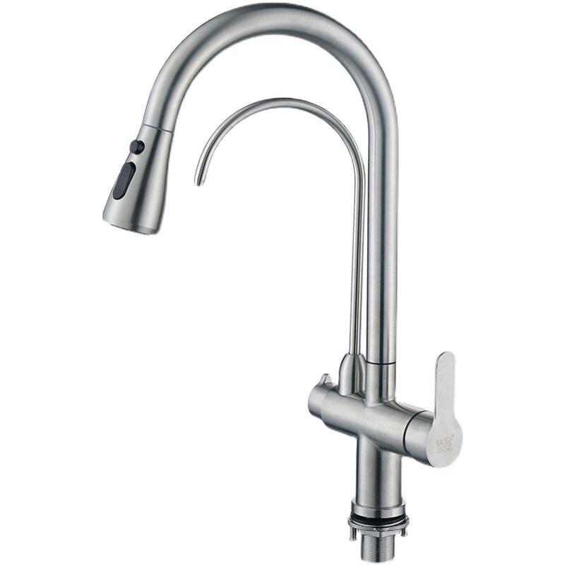 Kitchen pull-out tap Three-in-one hot and cold 304 stainless steel sink Home washing basin swivel straight drinking water purification