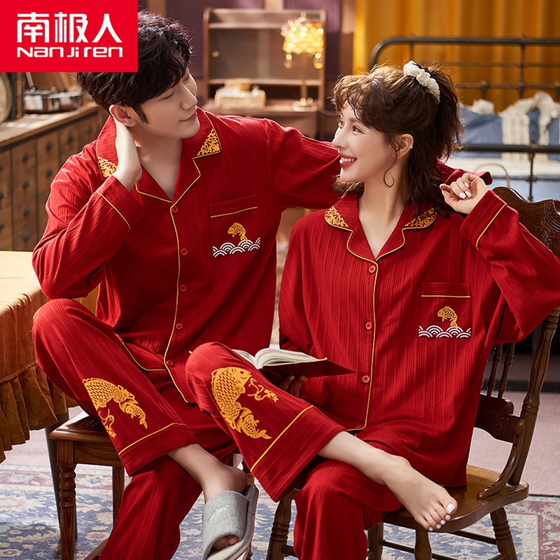 Pure cotton wedding couple pajamas wedding suit spring and autumn high-end wedding red natal winter home clothes women