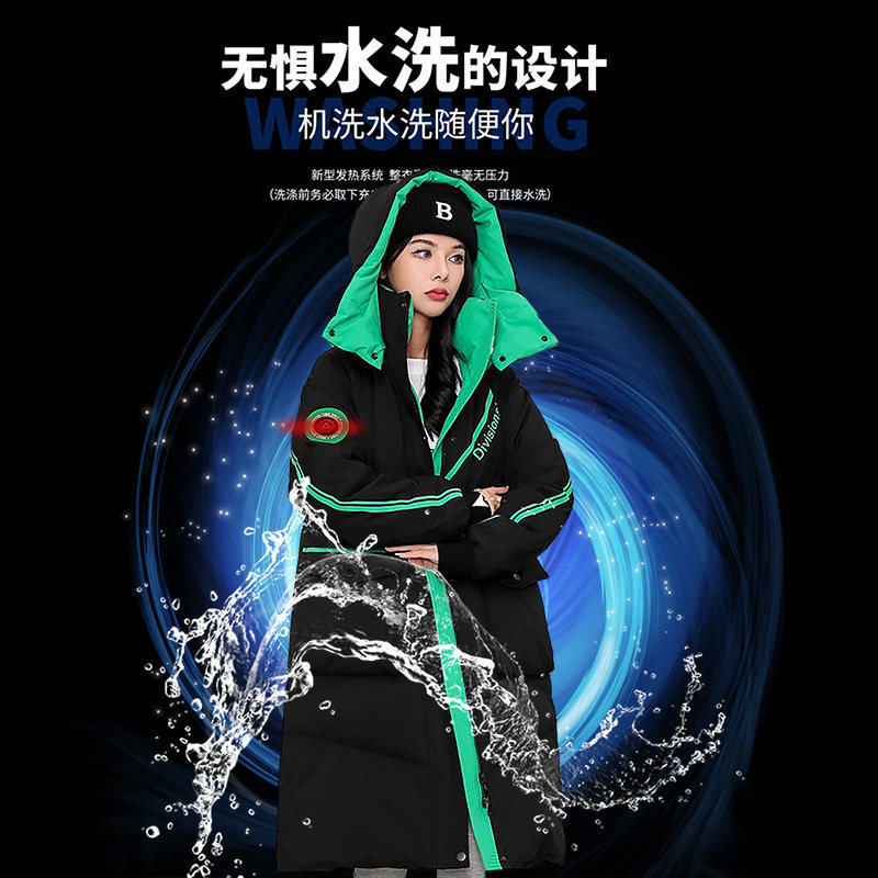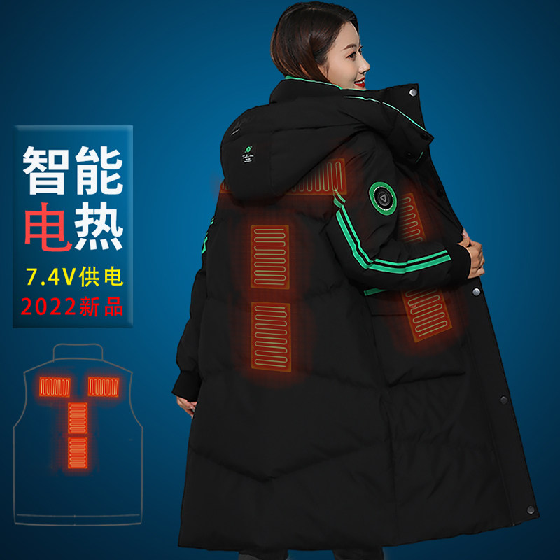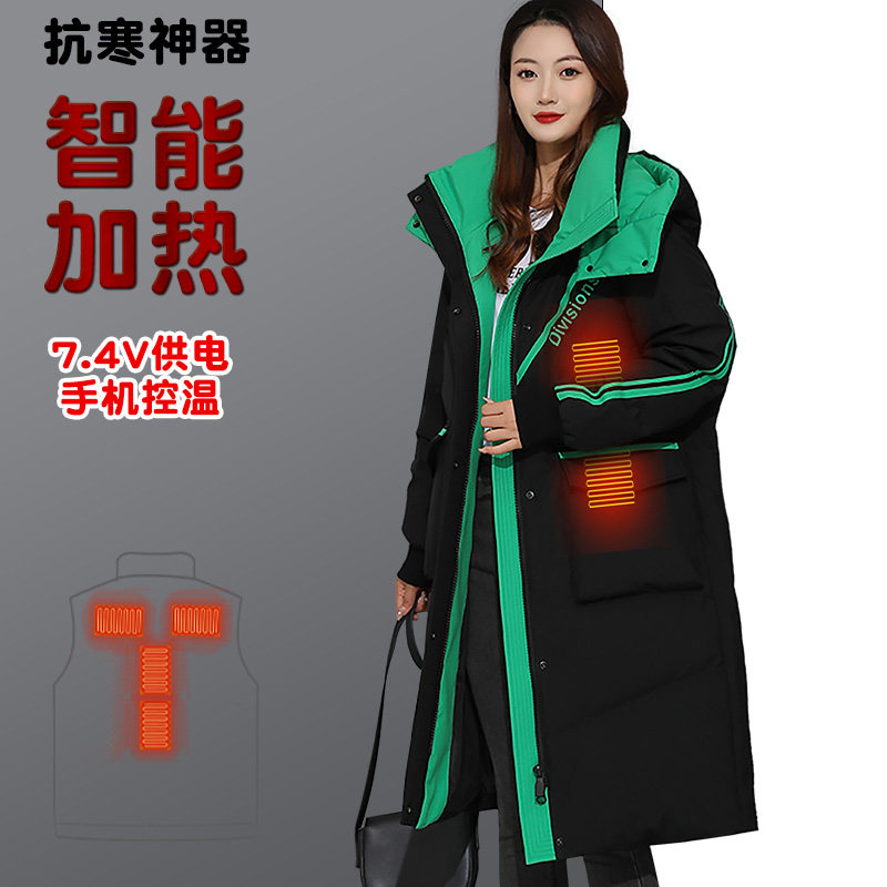 Intelligent heating down jacket electric heating white duck down couple men and women winter thickening cold-proof electric heating medium and long version outer wear