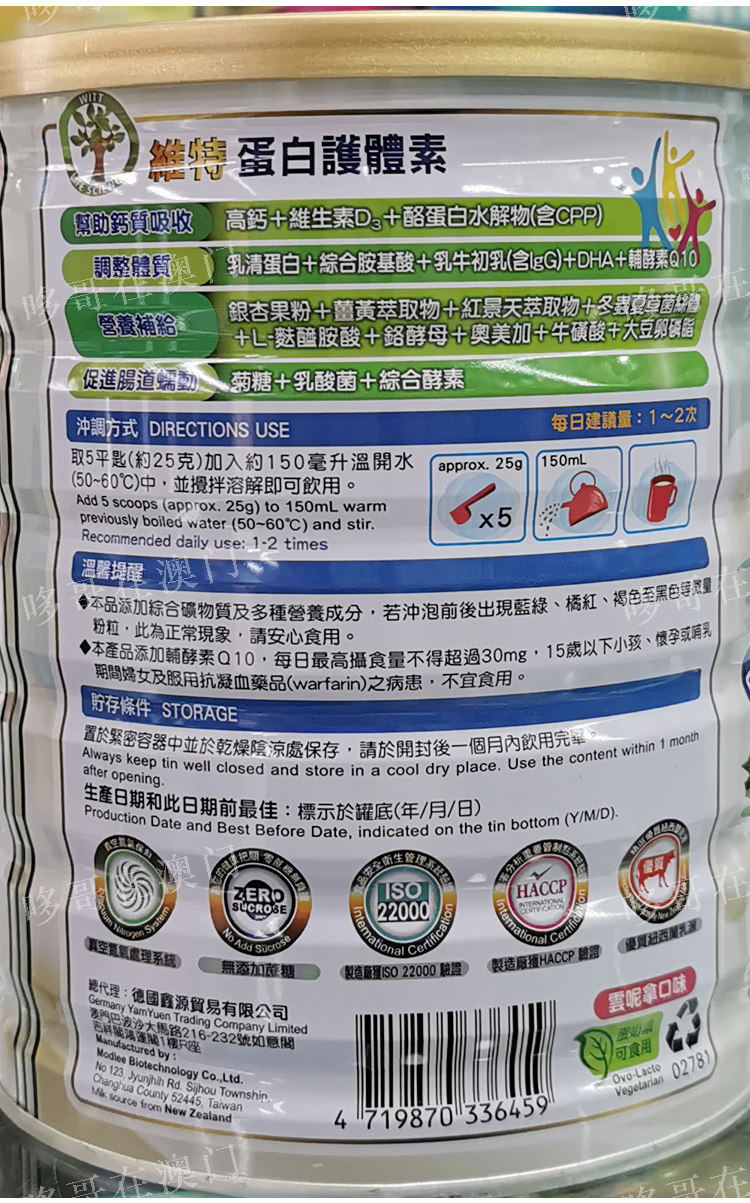 Macao originally installed Taiwan WITT Witt protein protective body vegetarian nutrition milk powder 900g