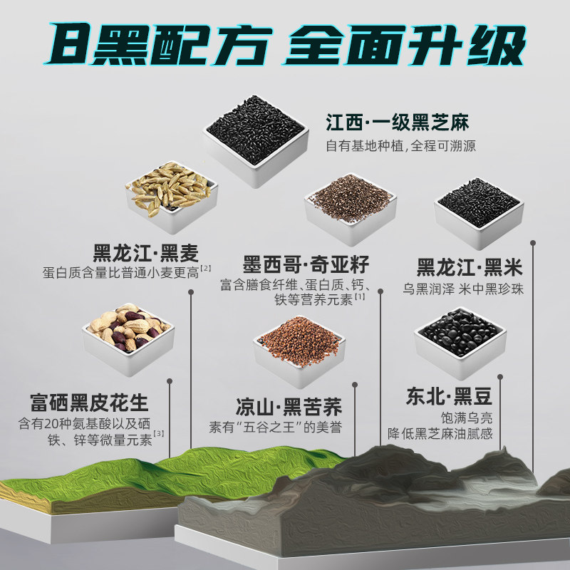 Black sesame (≥52%) maltitol polydextrose, black rice, black beans, chia seeds, black tartary buckwheat, rye, black skin, peanuts, black sesame peptides (>0 1%)