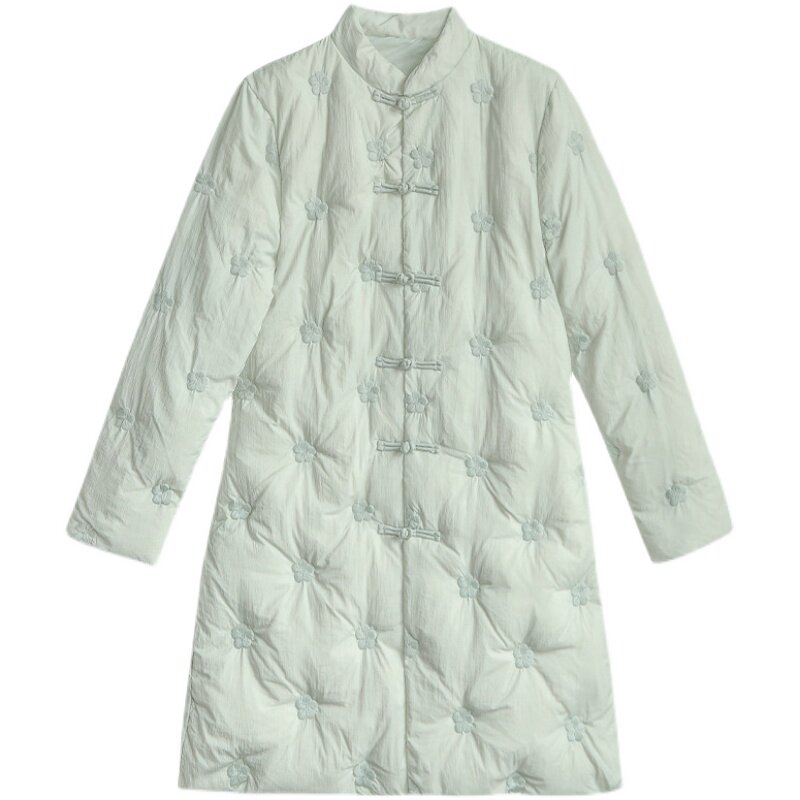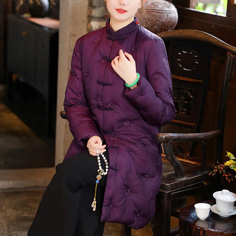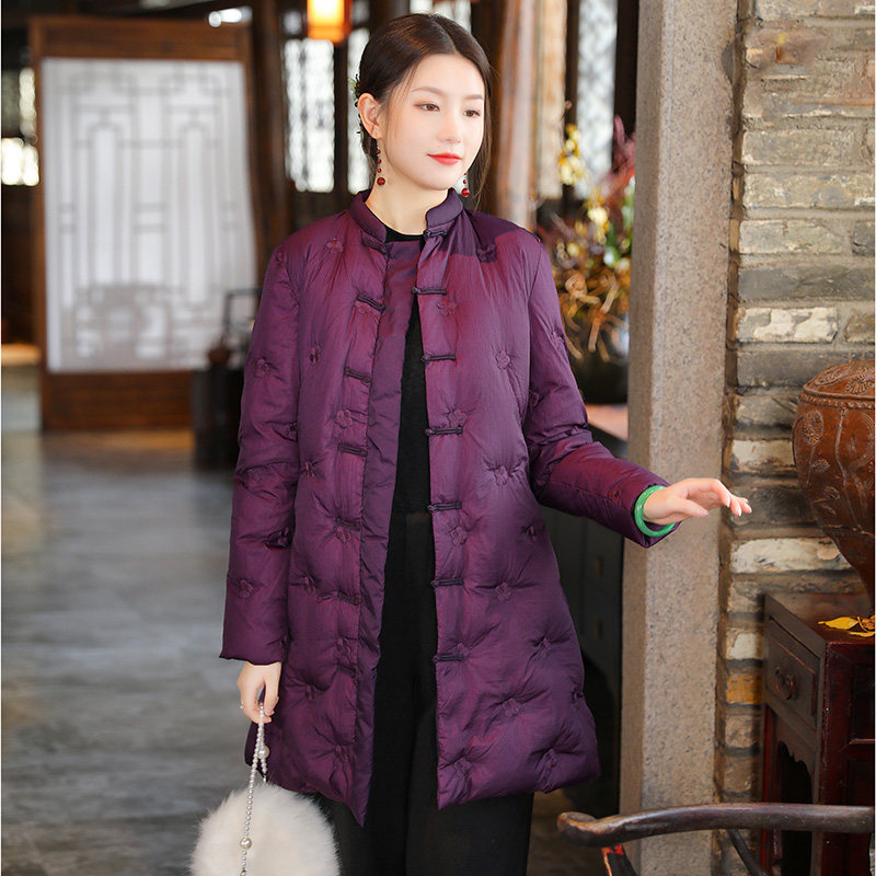 Lightweight Chinese style plate button down jacket women's mid-length version retro Republic of China women's Chinese jacket Zen tea suit winter