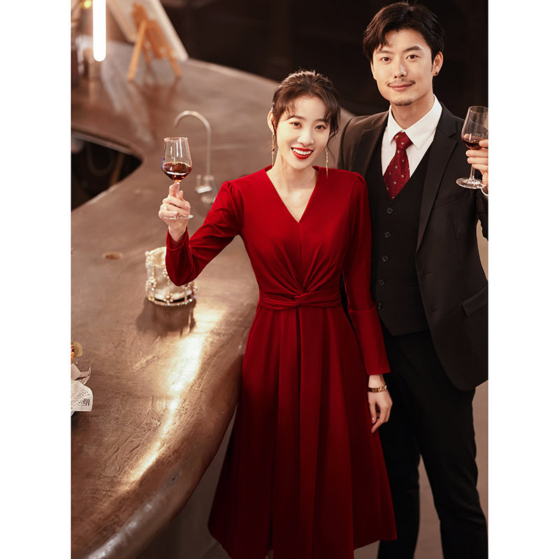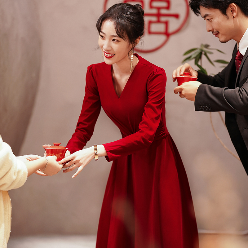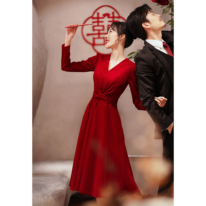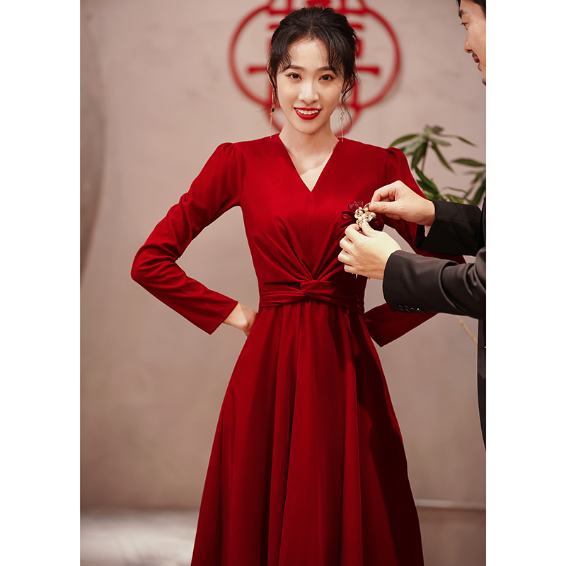 V collar toast brides red 2022 new everyday long sleeves engagement back door gown dress little sub high level