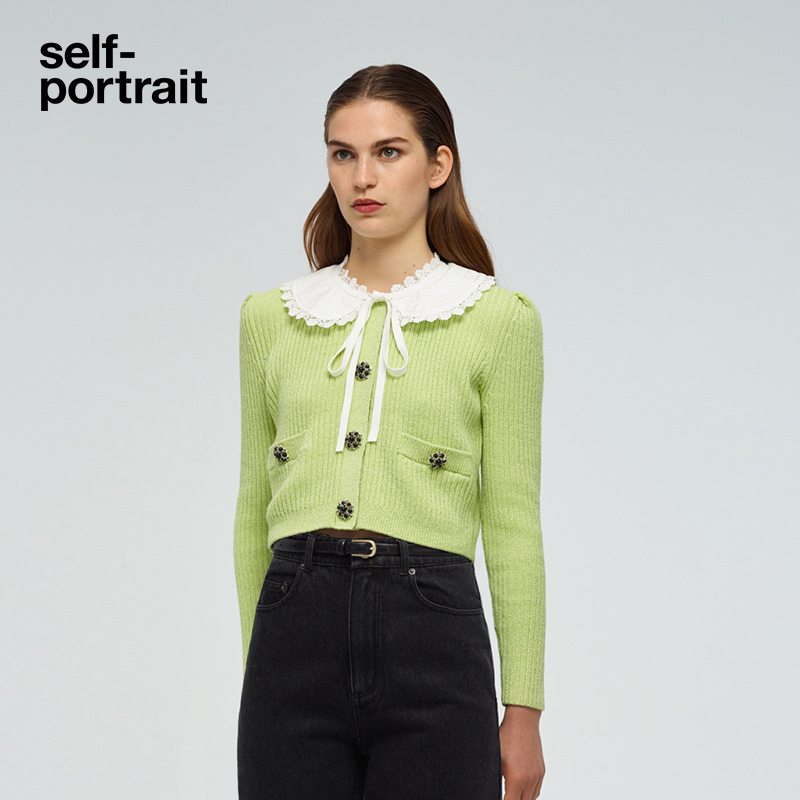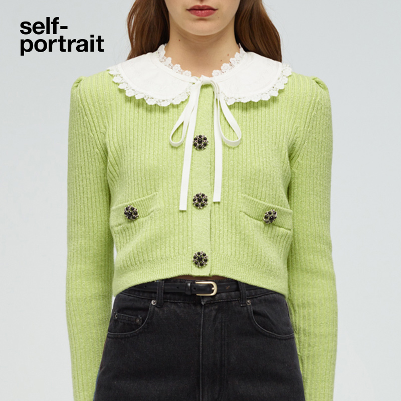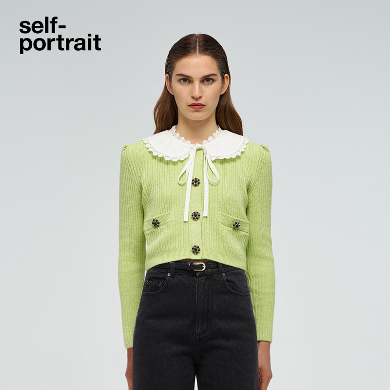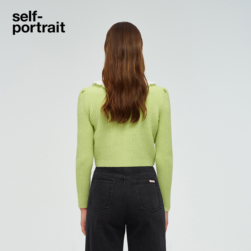 self-portrait fruit green bow-tie doll-neck knitted long-sleeve top