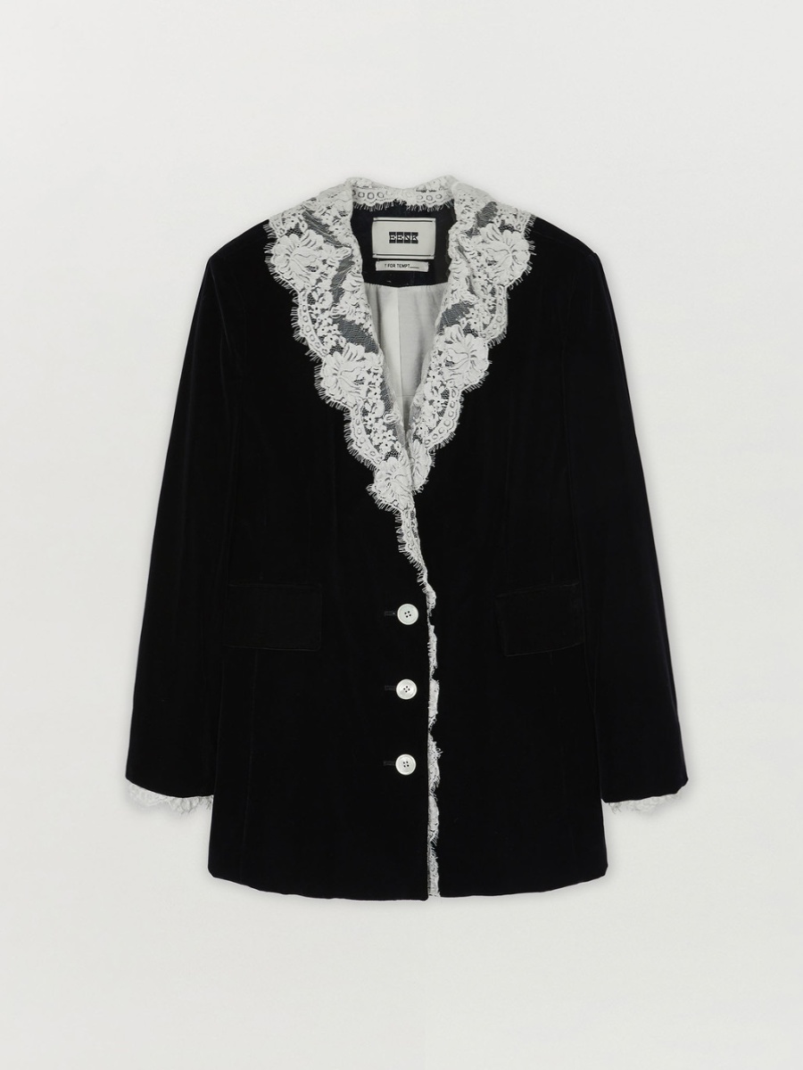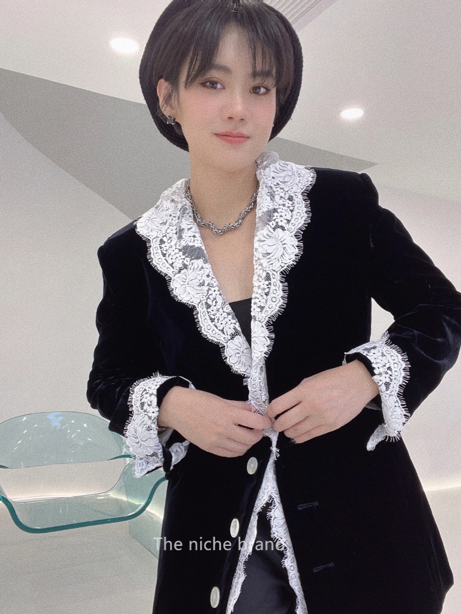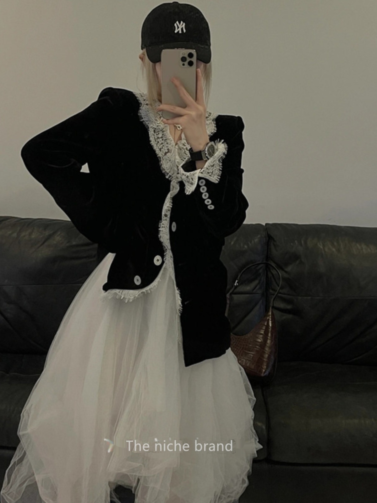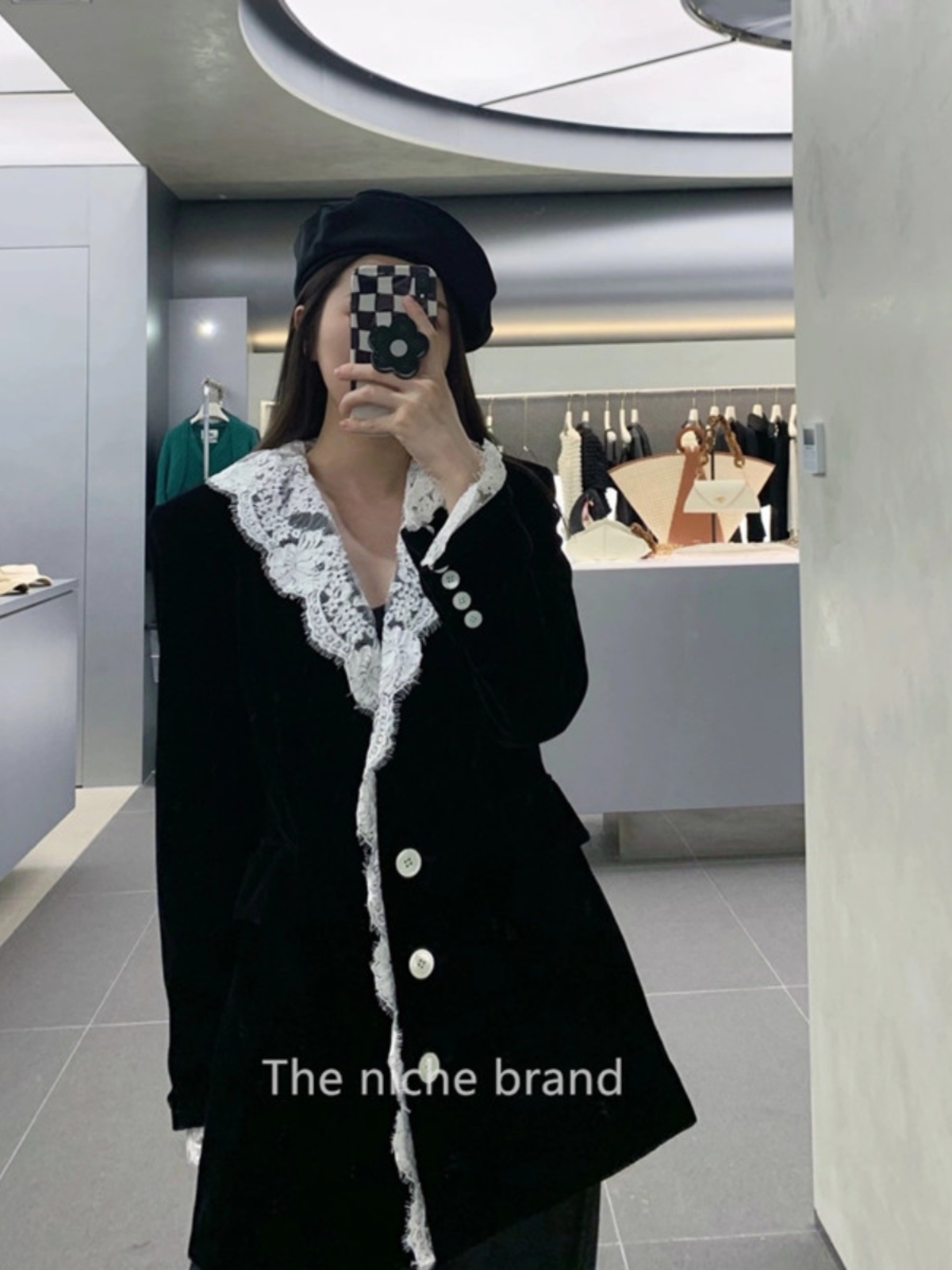 Korean EENK retro jacket lace spliced velvet blazer casual versatile black top