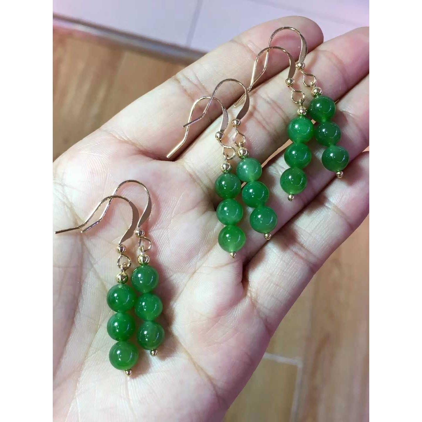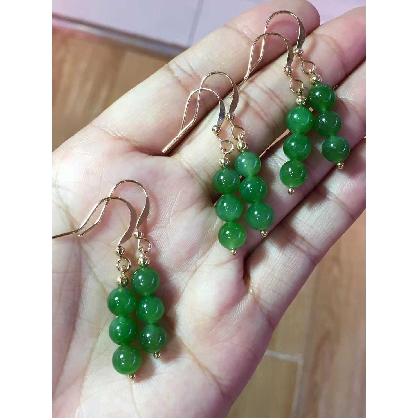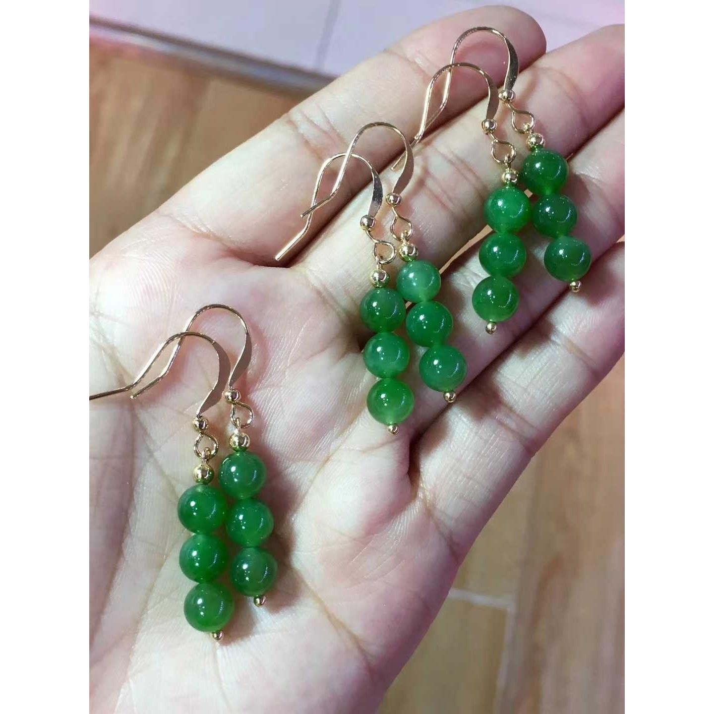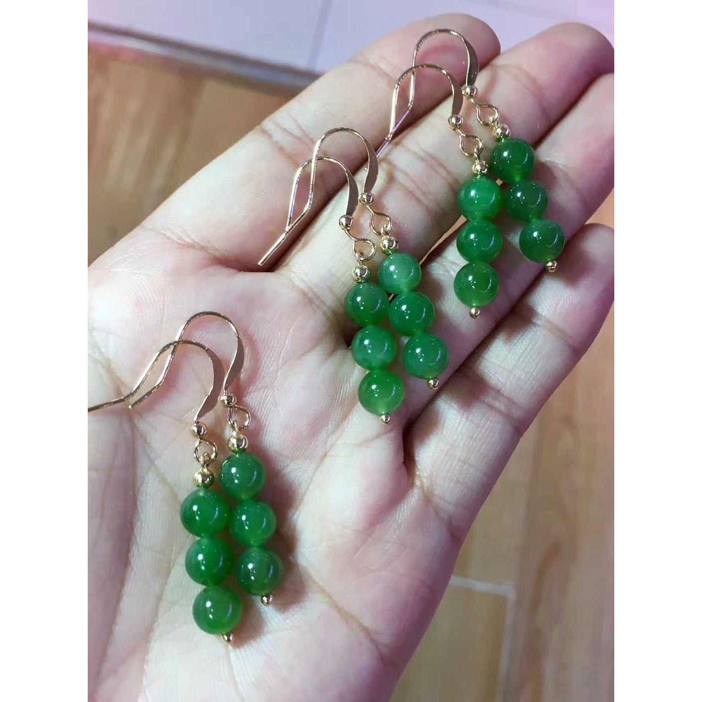 Natural Xinjiang Hetian jasper 6mm bead earrings 14k gold inlaid original ear wire hook ice transparent sun green spinach green