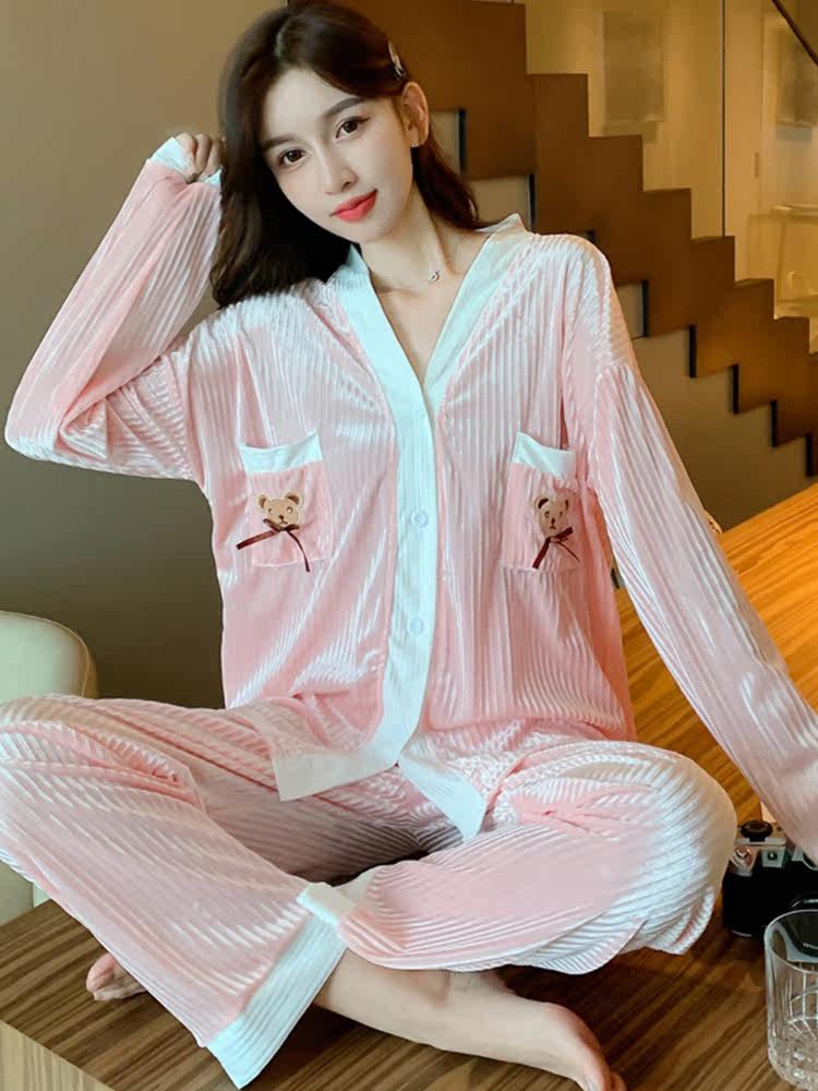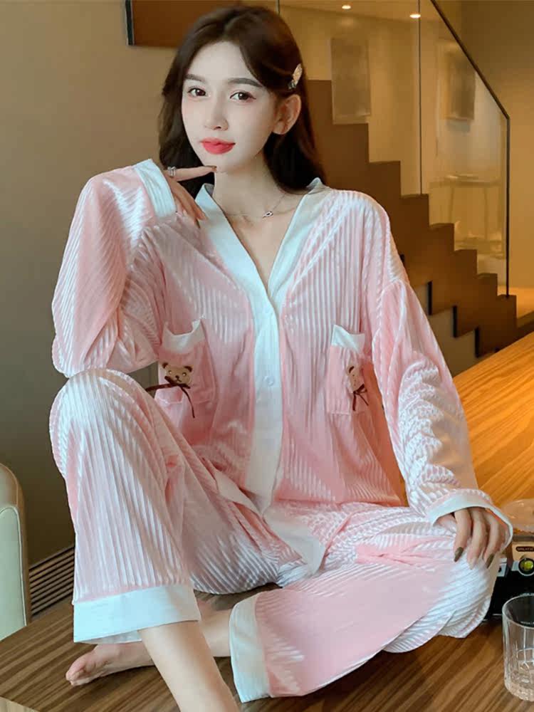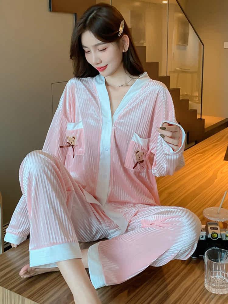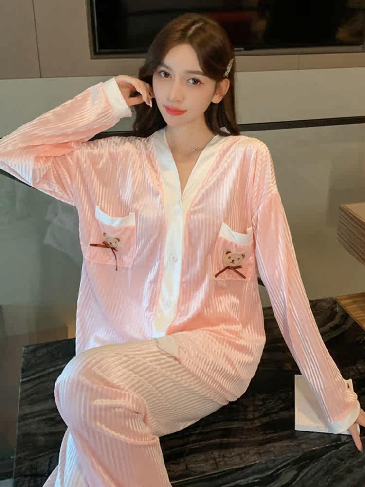 2022 New Ins Wind Fashion Pyjamas Women Spring Autumn Season Gold Velvet V Collar Winter Casual Home Clothing Two Sets