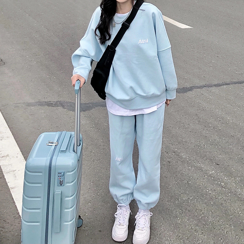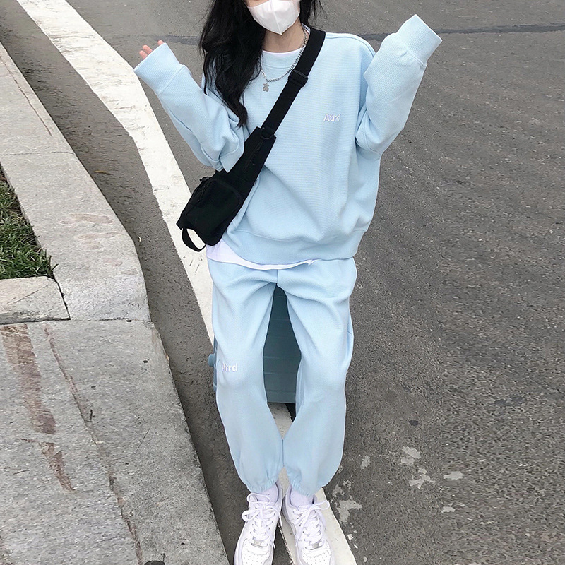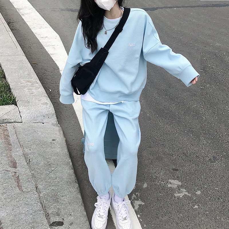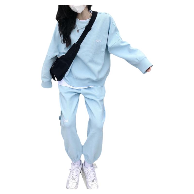 2022 Spring Autumn New Casual Sports Blue Suit Fried Street Nets Red Chi Thin Suede Pure Cotton Casual Blouse Embroidered Two Pieces