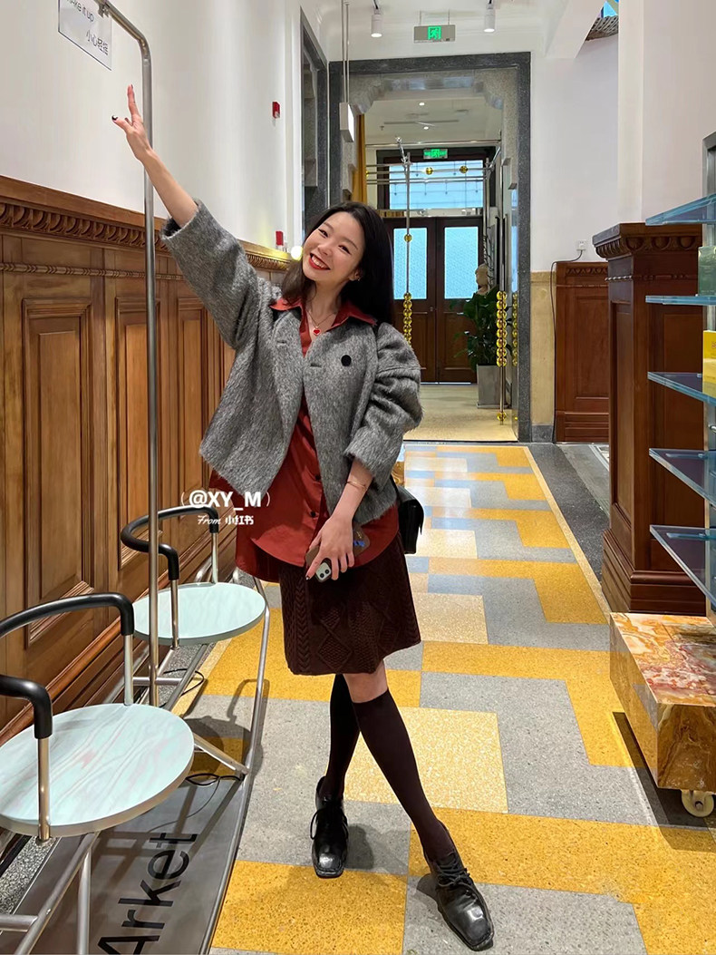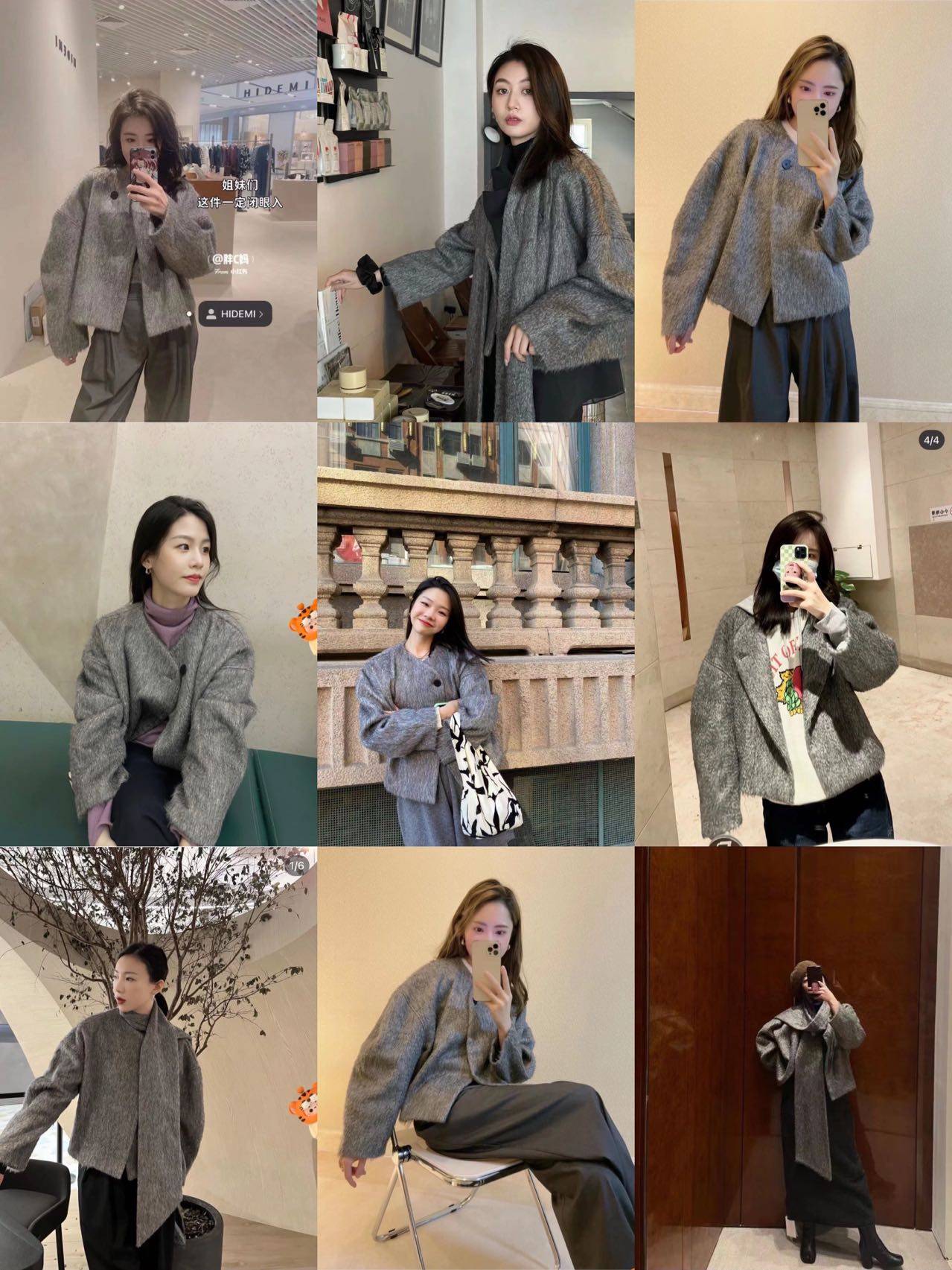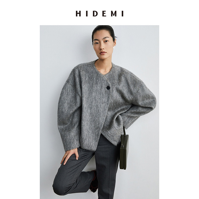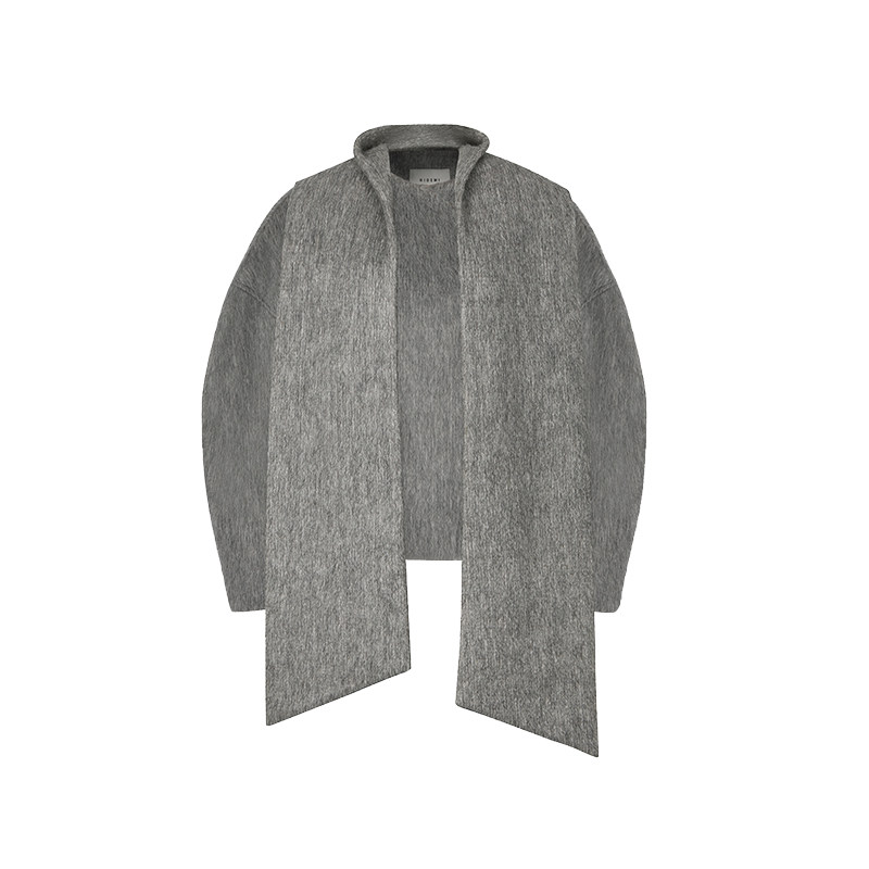 HIDEMI ink grey imported mohair detachable scarf design short cocoon two-piece coat