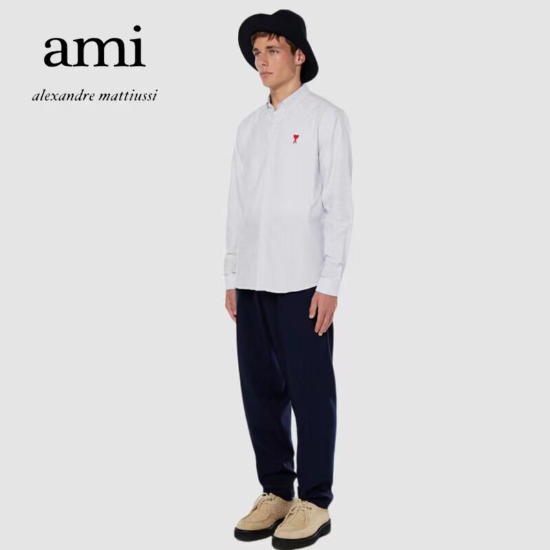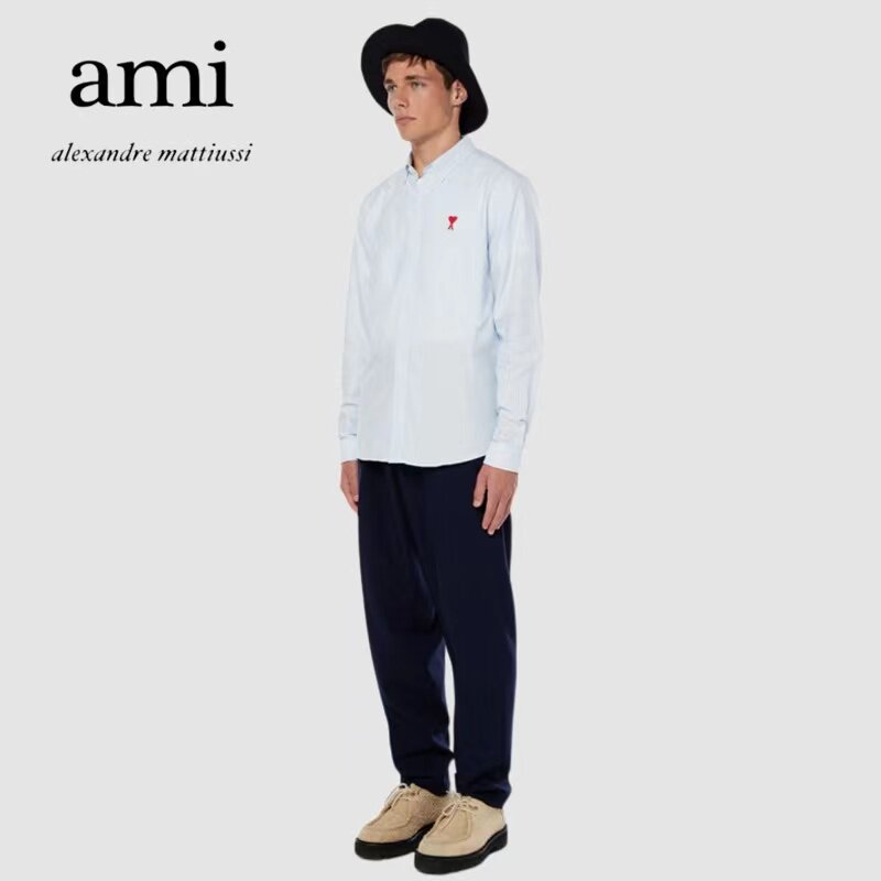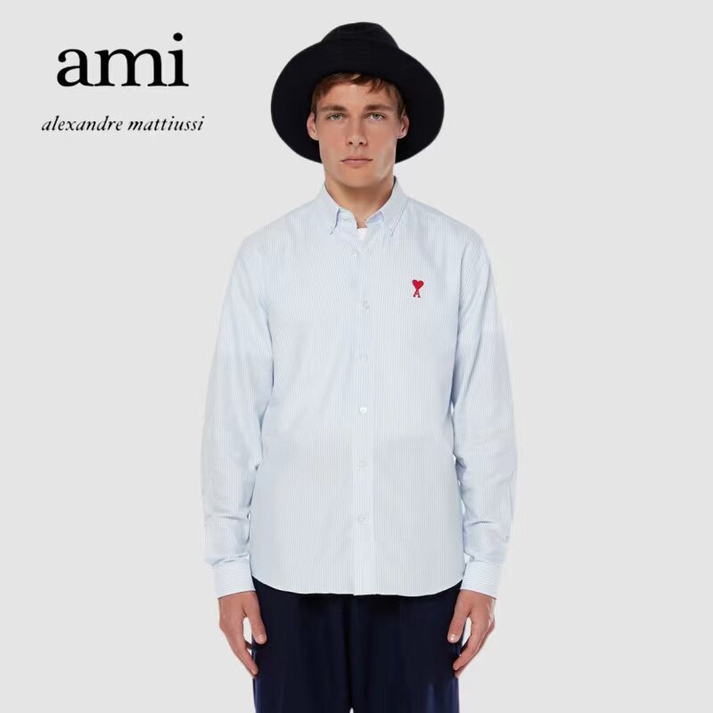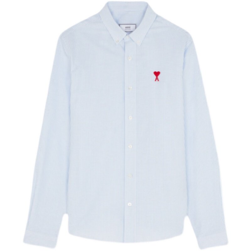 Ami Paris 21 Spring Autumn New free ironing pointed collar Long sleeves shirt for men and women Red Loving Embroidered Striped Shirts