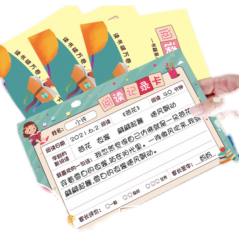 Primary school students use reading record cards for grades one, two, and three to accumulate excerpts from this book, good words and sentences, and cumulative card reading