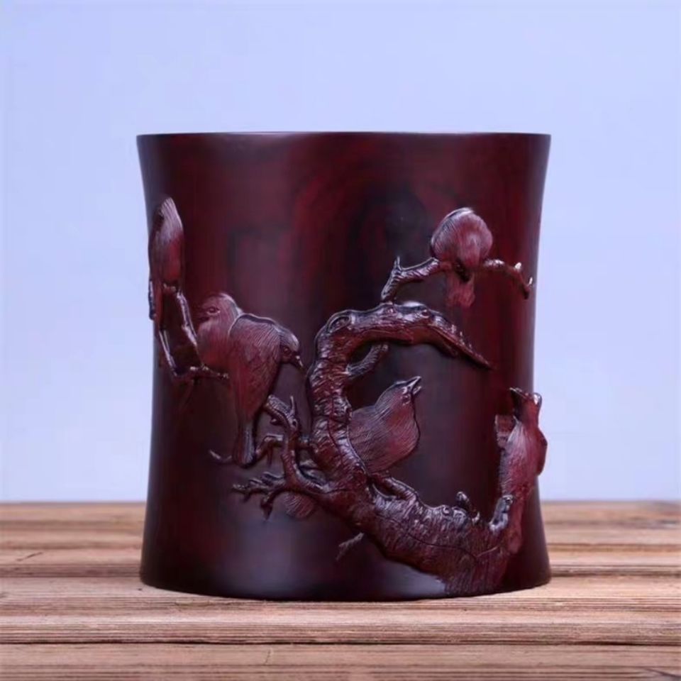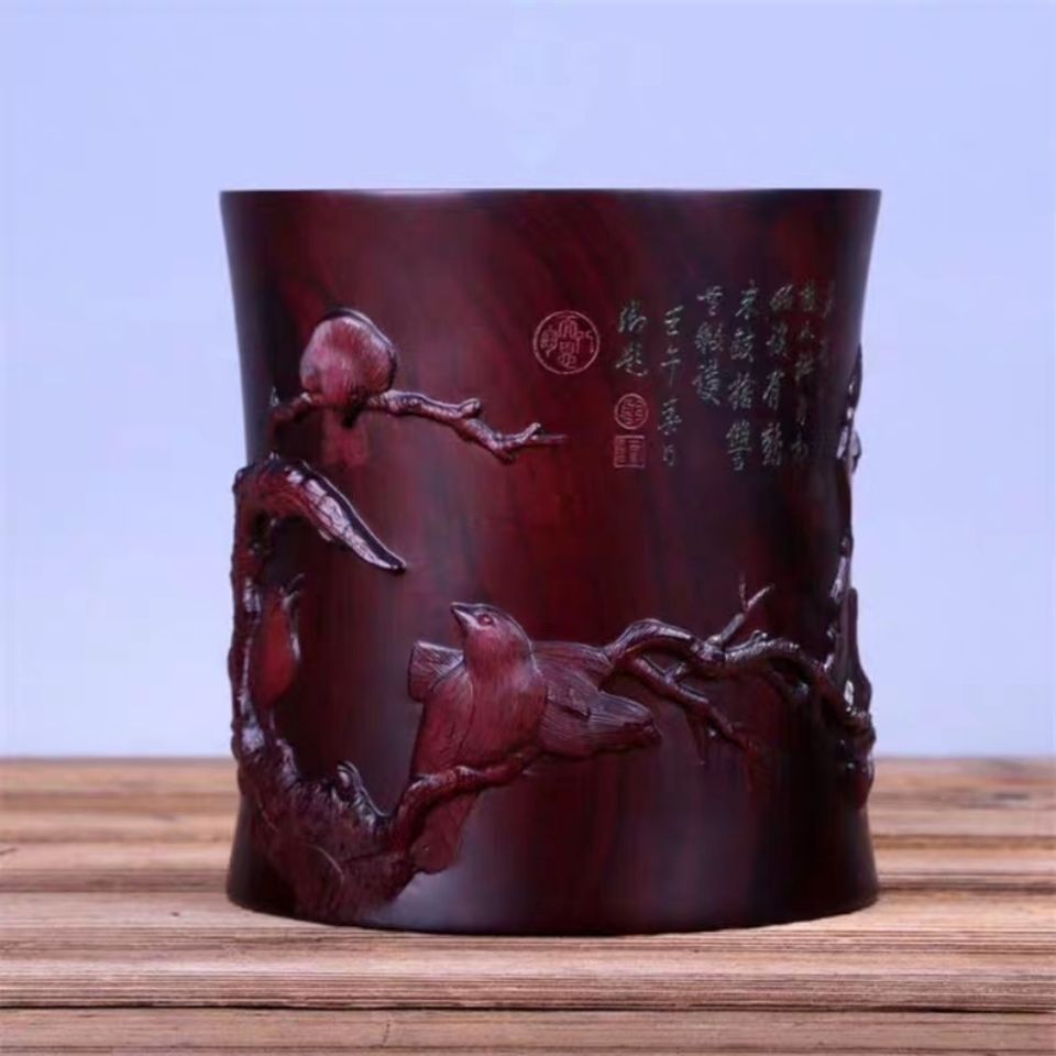 Rose red sandalwood cold bird figure solid wood mahogany pen holder high-end relief four treasures of the study table top gifts