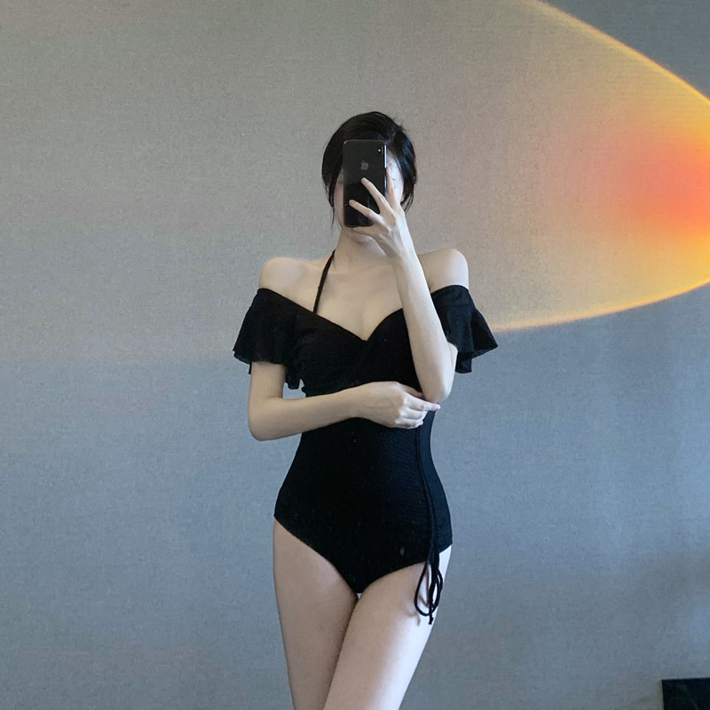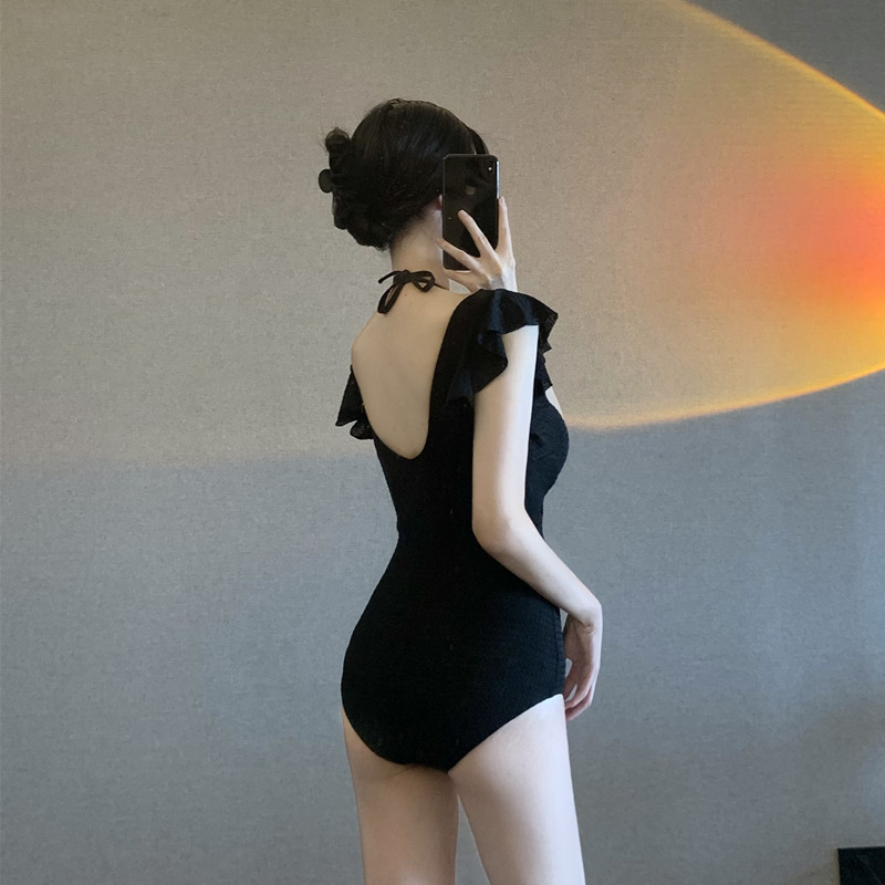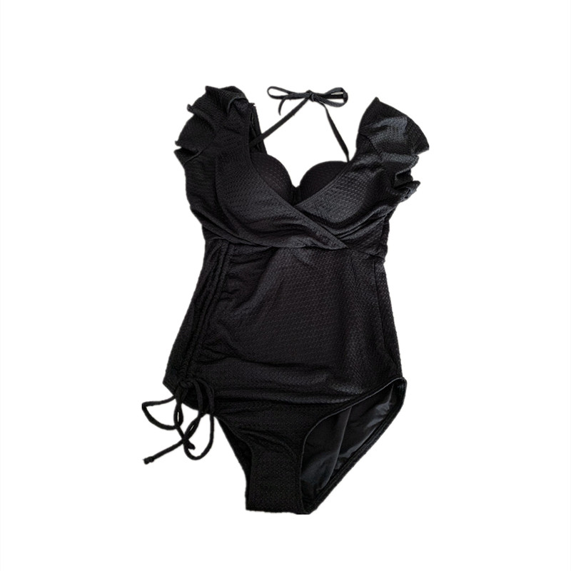 Hot spring swimsuit women's 2021 new hot style black one-piece deep v sexy slimming cover belly gather steel support swimsuit