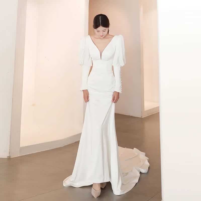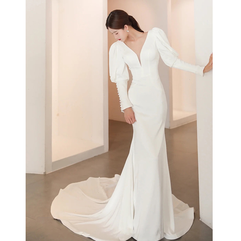 Sexy Deep V Evening Gown Lady Banter Long Sleeve 2021 New Temperament Fishtail Cashew THIN OUT OF THE DOOR YARN SMALL TUG TAIL END
